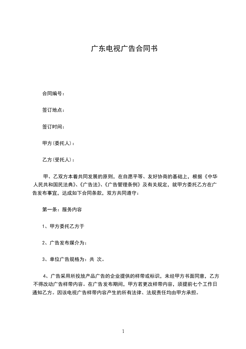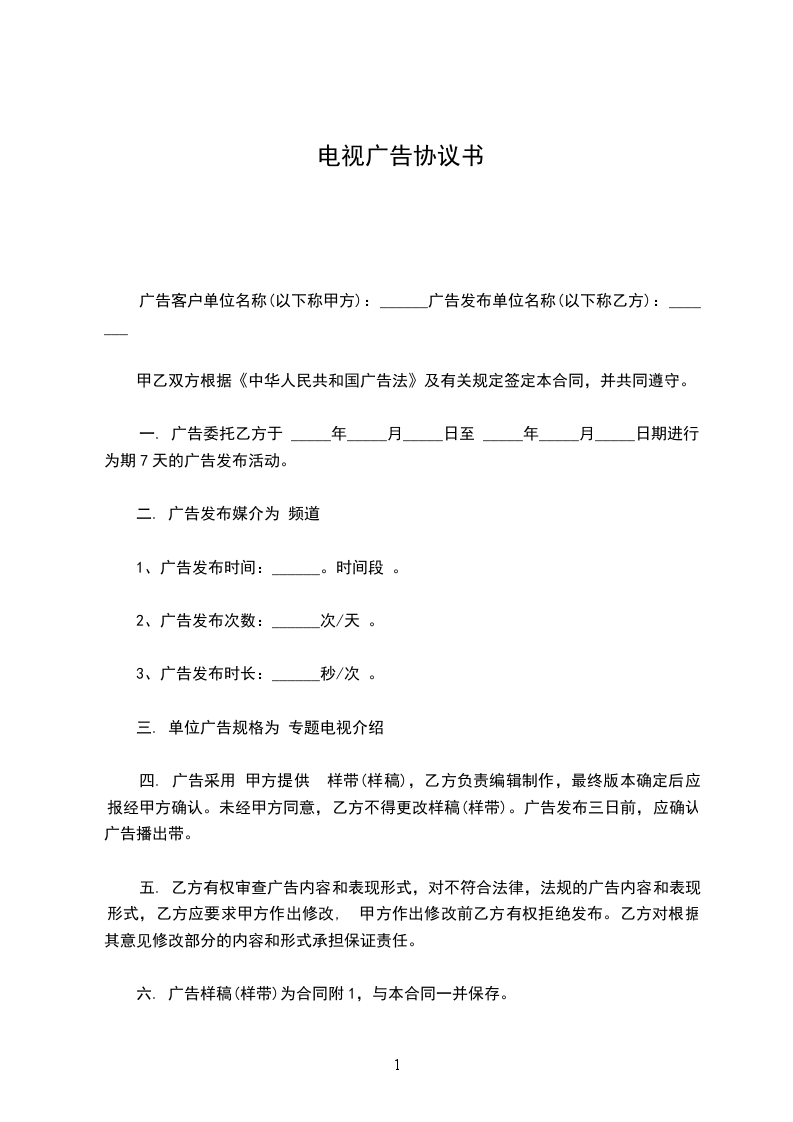 电视广告发布合同合同编号:甲方:__乙方:__甲、乙双方根据中华人民共和国广告法及有关法律法规和规章规定,本着平等互利的原则,经双方代表共同协商,就甲方广告发布事宜达成如下一致约定,共同遵守。