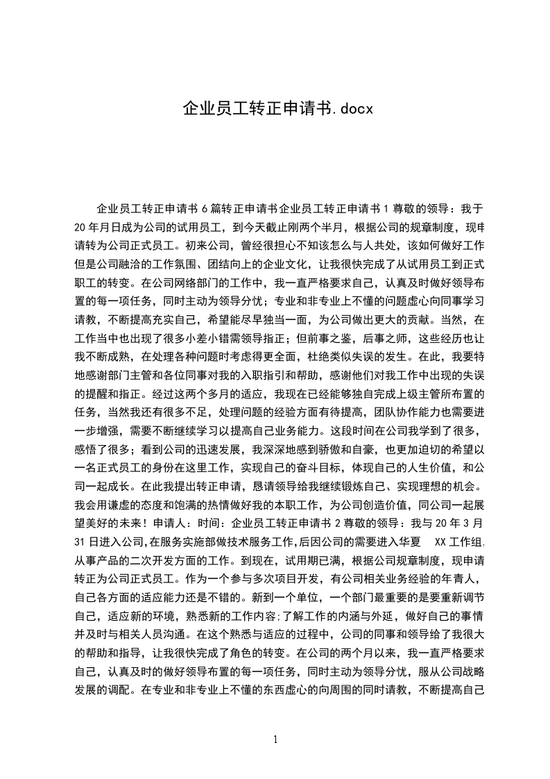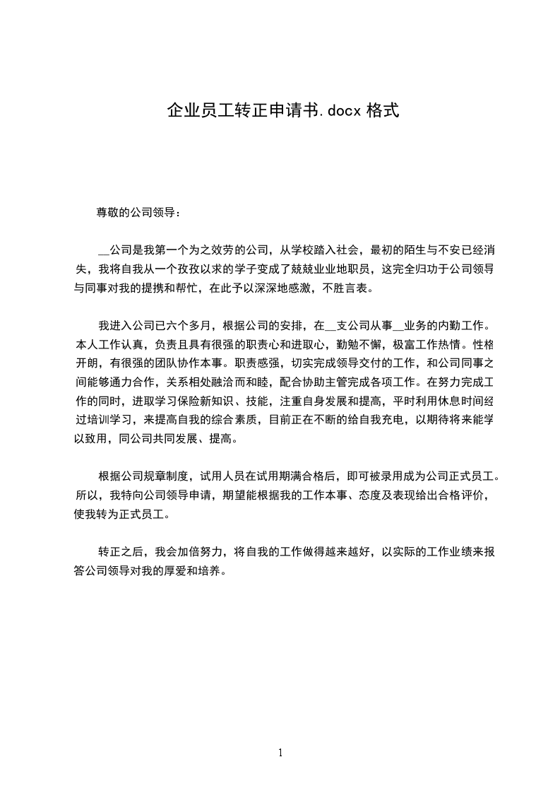 企业员工转正申请书6篇转正申请书企业员工转正申请书1尊敬的领导:我于20年月日成为公司的试用员工,到今天截止刚两个半月,根据公司的规章制度,现申请转为公司正式员工。初来公司,曾经很担心不知该怎么与人共处,该如何做好工作;但是公司融洽的工作氛围、团结向上的企业文化,让我很快完成了从试用员工到正式职工的转变。在公司网络部门的工作中,我一直严格要求自己,认真及时做好领导布置的每一项任务,同时主动为领导分忧;专业和非专业上不懂的问题虚心向同事学习请教,不断提高充实自己,希望能尽早独当一面,为公司做出更大的贡献。当然,在工作当中也出现了很多小差小错需领导指正;但前事之鉴,后事之师,这些经历也让我不断成熟,在处理各种问题时考虑得更全面,杜绝类似失误的发生。在此,我要特地感谢部门主管和各位同事对我的入职指引和帮助,感谢他们对我工作中出现的失误的提醒和指正。经过这两个多月的适应,我现在已经能够独自完成上级主管所布置的任务,当然我还有很多不足,处理问题的经验方面有待提高,团队协作能力也需要进一步增强,需要不断继续学习以提高自己业务能力。这段时间在公司我学到了很多,感悟了很多;看到公司的迅速发展,我深深地感到骄傲和自豪,也更加迫切的希望以一名正式员工的身份在这里工作,实现自己的奋斗目标,体现自己的人生价值,和公司一起成长。在此我提出转正申请,恳请领导给我继续锻炼自己、实现理想的机会。我会用谦虚的态度和饱满的热情做好我的本职工作,为公司创造价值,同公司一起展望美好的未来!申请人:时间:企业员工转正申请书2尊敬的领导:我与20年3月31日进入公司,在服务实施部做技术服务工作,后因公司的需要进入华夏XX工作组,从事产品的二次开发方面的工作。到现在,试用期已满,根据公司规章制度,现申请转正为公司正式员工。作为一个参与多次项目开发,有公司相关业务经验的年青人,自己各方面的适应能力还是不错的。新到一个单位,一个部门最重要的是要重新调节自己,适应新的环境,熟悉新的工作内容;了解工作的内涵与外延,做好自己的事情并及时与相关人员沟通。在这个熟悉与适应的过程中,公司的同事和领导给了我很大的帮助和指导,让我很快完成了角色的转变。在公司的两个月以来,我一直严格要求自己,认真及时的做好领导布置的每一项任务,同时主动为领导分忧,服从公司战略发展的调配。在专业和非专业上不懂的东西虚心的向周围的同时请教,不断提高自己,争取尽早独当一面,为公司作出更大的贡献。当然初入公司,难免出现一些小差错需要领导指正,但这些能让我更快的成长,在今后的工作中在处理各种问题的时候我会考虑的更加全面,杜绝类似错误的发生。在此我要特地感谢部门的领导和同事对我的指正和帮助,感谢他们对于我工作的失误给予的中肯的指正。来到这里工作我的收获最大的莫过于对工作的执着和热情,对自己的敬业精神,业务素质和思想水平都有了很大的提高,希望在以后的工作中继续提高自己,增加自己的能力,为公司的发展作出自己应有的贡献。在此提出转正申请,恳请领导给我继续锻炼,实现理想的机会。我会用谦虚的态度和饱满热情做好本职工作,为公司创造价值,为自己展开美好的未来。我是到华夏XX工作组以后正式开始从事产品的二次开发工作。由于我在之前又做过OA工作流项目的经验,对工作流的各个环节还是比较熟悉,所以对开展新的工作并不难。但作为产品的工作流开发,我要关注的并不只是实现工作流,而是在产品自身已有的基础上添加功能,一次需要对产品的模块非常了解,这也是作为我刚开展计划跟踪工作的首要目标。自那以后对产品的整体功能,架构,以及数据库。我都作了进一步的了解。在这两个月中,我严格按照项目进度要求,完成项目上的开发任务。主要参与了项目的CR流程的开发,项目流程的设计与开发。其中遇到问题,与同事共同商讨,研究解决方案,对于一些功能的实现需要公司支持的,通过公司的研发人员的支持,大部分也都得到了解决,现在项目已经进入到编码及测试阶段。在测试过程中也发现了自己做的不足的地方。我会吸取自身的不足,努力提高自己,让自己不断的成长。希望以后可以独当一面。到目前为止,可以很好的完成领导指派的人物,以后我还要继续努力,将工作完成的更好。完成上司下达给我的任务。希望自己可以在公司提供的更大的舞台上发挥自己的价值,为公司的发展做出更多的贡献。现在我的试用期已过,申请转正,请领导考虑,予以批准。谢谢!此致敬礼申请人:年月日企业员工转正申请书3尊敬的领导:我叫,于年月日进入公司,根据公司的需要,目前担任装载机操作一职,负责沥青站搅拌站上料工作。本人工作认真、细心且具有较强的责任心和进取心,极富工作热情;性格开朗,乐于与他人沟通,有很强的团队协作能力;责任感强,确实完成领导交付的工作,和公司同事之间能够通力合作,我自20年7月工作以来,一直从事沥青站搅拌站上料工作,因此,我对公司这个岗位的工作可以说驾轻就熟,并且我在很短的时间内熟悉了公司以及有关工作的基本情况,马上进入工作。现将三个月的工作情况简要总结如下:熟练装载机的操作规程及维护保养。熟悉装载机上料的操作