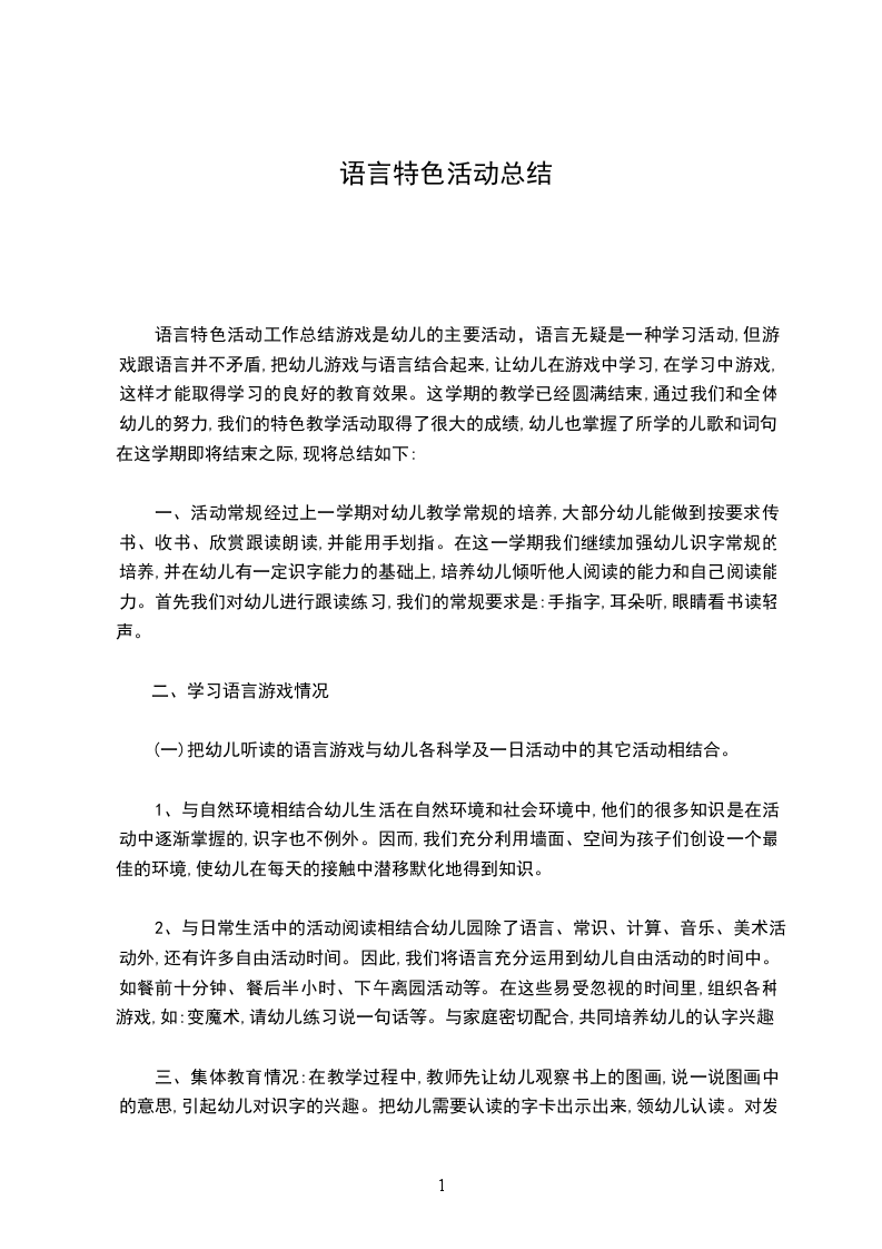 语言特色活动工作总结游戏是幼儿的主要活动,语言无疑是一种学习活动,但游戏跟语言并不矛盾,把幼儿游戏与语言结合起来,让幼儿在游戏中学习,在学习中游戏,这样才能取得学习的良好的教育效果。这学期的教学已经圆满结束,通过我们和全体幼儿的努力,我们的特色教学活动取得了很大的成绩,幼儿也掌握了所学的儿歌和词句,在这学期即将结束之际,现将总结如下: