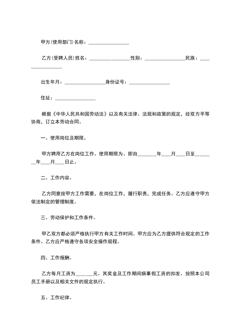 甲方聘用乙方在岗位工作。使用期限为。即自________年________月________日至________年________月________日止。