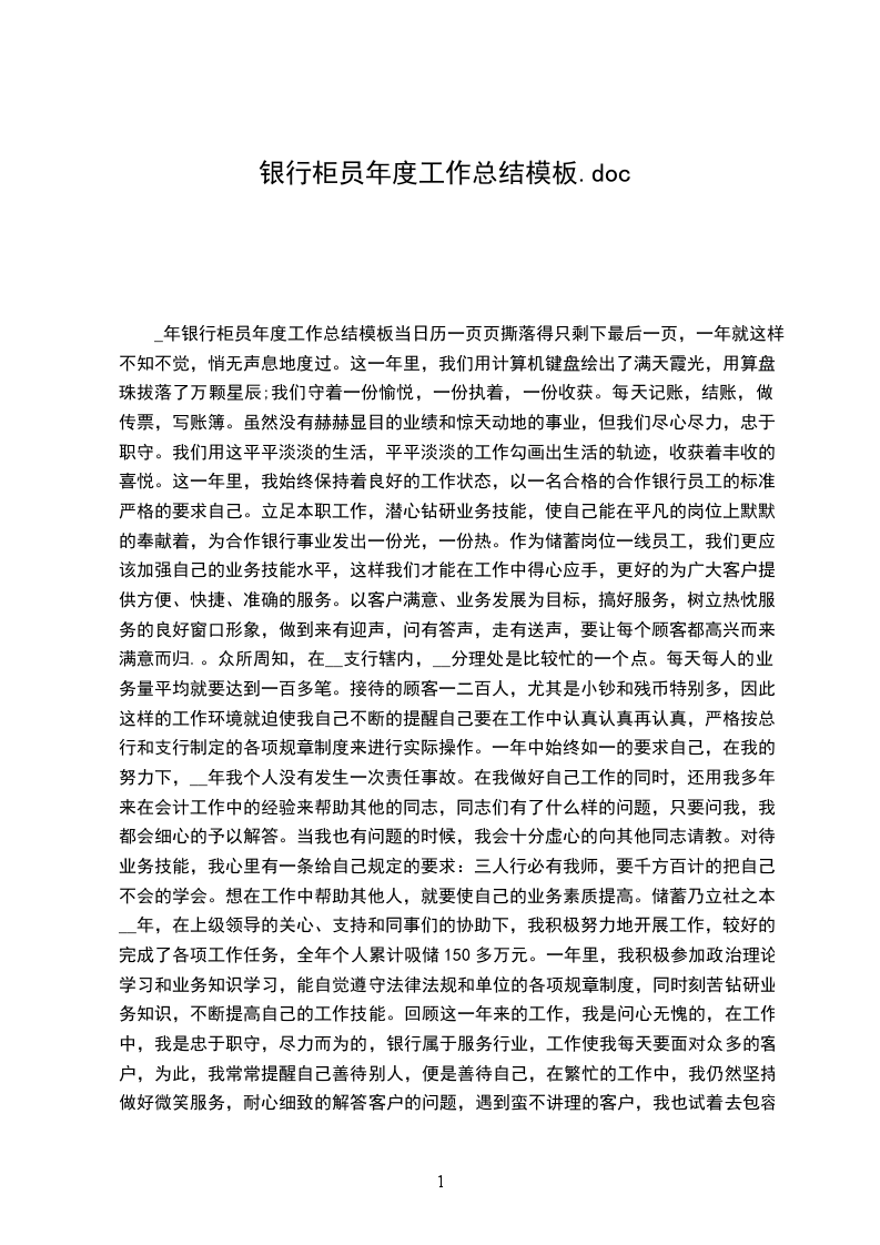 _年银行柜员年度工作总结模板当日历一页页撕落得只剩下最后一页,一年就这样不知不觉,悄无声息地度过。这一年里,我们用计算机键盘绘出了满天霞光,用算盘珠拔落了万颗星辰;我们守着一份愉悦,一份执着,一份收获。每天记账,结账,做传票,写账簿。虽然没有赫赫显目的业绩和惊天动地的事业,但我们尽心尽力,忠于职守。我们用这平平淡淡的生活,平平淡淡的工作勾画出生活的轨迹,收获着丰收的喜悦。这一年里,我始终保持着良好的工作状态,以一名合格的合作银行员工的标准严格的要求自己。立足本职工作,潜心钻研业务技能,使自己能在平凡的岗位上默默的奉献着,为合作银行事业发出一份光,一份热。作为储蓄岗位一线员工,我们更应该加强自己的业务技能水平,这样我们才能在工作中得心应手,更好的为广大客户提供方便、快捷、准确的服务。以客户满意、业务发展为目标,搞好服务,树立热忱服务的良好窗口形象,做到来有迎声,问有答声,走有送声,要让每个顾客都高兴而来满意而归.。众所周知,在__支行辖内,__分理处是比较忙的一个点。每天每人的业务量平均就要达到一百多笔。接待的顾客一二百人,尤其是小钞和残币特别多,因此这样的工作环境就迫使我自己不断的提醒自己要在工作中认真认真再认真,严格按总行和支行制定的各项规章制度来进行实际操作。一年中始终如一的要求自己,在我的努力下,__年我个人没有发生一次责任事故。在我做好自己工作的同时,还用我多年来在会计工作中的经验来帮助其他的同志,同志们有了什么样的问题,只要问我,我都会细心的予以解答。当我也有问题的时候,我会十分虚心的向其他同志请教。对待业务技能,我心里有一条给自己规定的要求:三人行必有我师,要千方百计的把自己不会的学会。想在工作中帮助其他人,就要使自己的业务素质提高。储蓄乃立社之本,__年,在上级领导的关心、支持和同事们的协助下,我积极努力地开展工作,较好的完成了各项工作任务,全年个人累计吸储150多万元。一年里,我积极参加政治理论学习和业务知识学习,能自觉遵守法律法规和单位的各项规章制度,同时刻苦钻研业务知识,不断提高自己的工作技能。回顾这一年来的工作,我是问心无愧的,在工作中,我是忠于职守,尽力而为的,银行属于服务行业,工作使我每天要面对众多的客户,为此,我常常提醒自己善待别人,便是善待自己,在繁忙的工作中,我仍然坚持做好微笑服务,耐心细致的解答客户的问题,遇到蛮不讲理的客户,我也试着去包容和理解他,最终也得到了客户的理解和尊重。回顾检查自身存在的问题,我认为:一是学习不够。当前,以信息技术为基础的新经济蓬勃发展,新情况新问题层出不穷,新知识新科学不断问世。面对严峻的挑战,缺乏学习的紧迫感和自觉性。理论基础、专业知识、文化水平、工作方法等不能适应新的要求。二是在工作较累的时候,有过松弛思想,这是自己政治素质不高,也是世界观、人生观、价值观解决不好的表现。针对以上问题,今后的努力方向是:一是加强理论学习,进一步提高自身素质。转变工作作风,努力克服自己的消极情绪,提高工作质量和效率,积极配合领导和同事们把工作做得更好。新的一年里我应加紧学习,更好的充实自己,以饱满的精神状态来迎接新时期的挑战,总结过去,是为了吸取过去的经验和教训,更好地干好今后的工作。工作中的不足和欠缺,请各位领导和同事批评、指正。