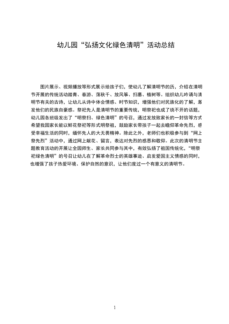 图片展示、视频播放等形式展示给孩子们,使幼儿了解清明节的历,介绍在清明节开展的传统活动踏青、春游、荡秋千、放风筝、扫墓、植树等。组织幼儿吟诵与清明节有关的古诗,让幼儿从诗中体会情感、时节知识,增强他们对民族化的了解,激发他们的民族自豪感。祭祀先人是清明节的重要传统,明祭祀也成了绕不开的话题,幼儿园各班级发出了“明祭扫、绿色清明”的号召,通过发放致家长的一封信等方式希望我园家长能以鲜花祭祀等形式明祭祖,鼓励家长带孩子一起去瞻仰革命先烈,感受幸福生活的同时,缅怀先人的大无畏精神。除此之外,老师们也积极参与到“网上祭先烈”活动中,通过网上献花、留言,表达对先烈的感恩和敬仰。此次的清明节主题教育活动的开展让全园师生、家长共同参与其中,有效弘扬了祖国传统化,“明祭祀绿色清明”的号召让幼儿在了解革命烈士的英雄事迹、启发爱国主义情感的同时,也增强了孩子热爱环境、保护自然的意识,让他们度过一个有意义的清明节。
