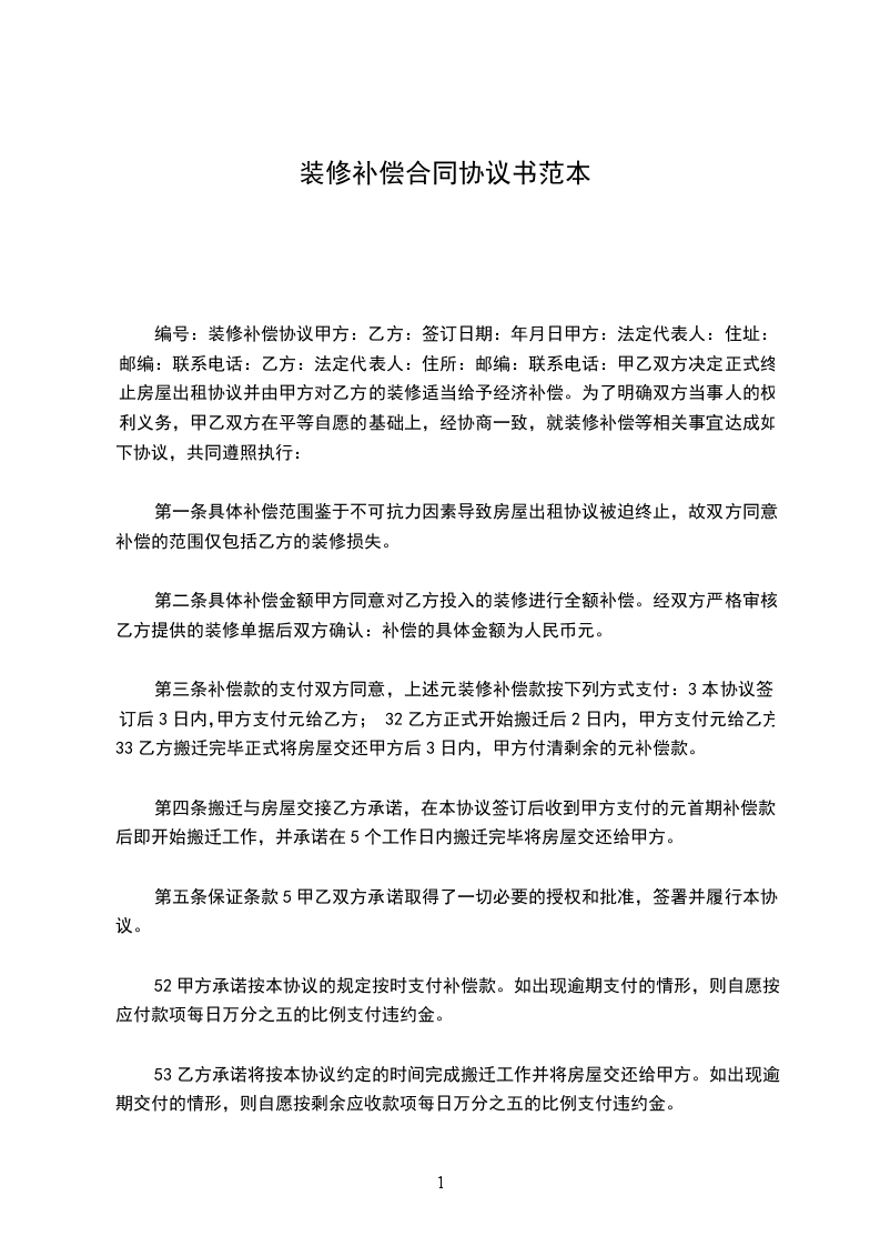 编号:装修补偿协议甲方:乙方:签订日期:年月日甲方:法定代表人:住址:邮编:联系电话:乙方:法定代表人:住所:邮编:联系电话:甲乙双方决定正式终止房屋出租协议并由甲方对乙方的装修适当给予经济补偿。为了明确双方当事人的权利义务,甲乙双方在平等自愿的基础上,经协商一致,就装修补偿等相关事宜达成如下协议,共同遵照执行:
