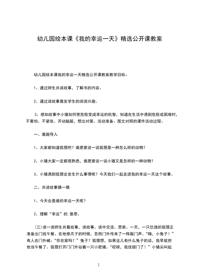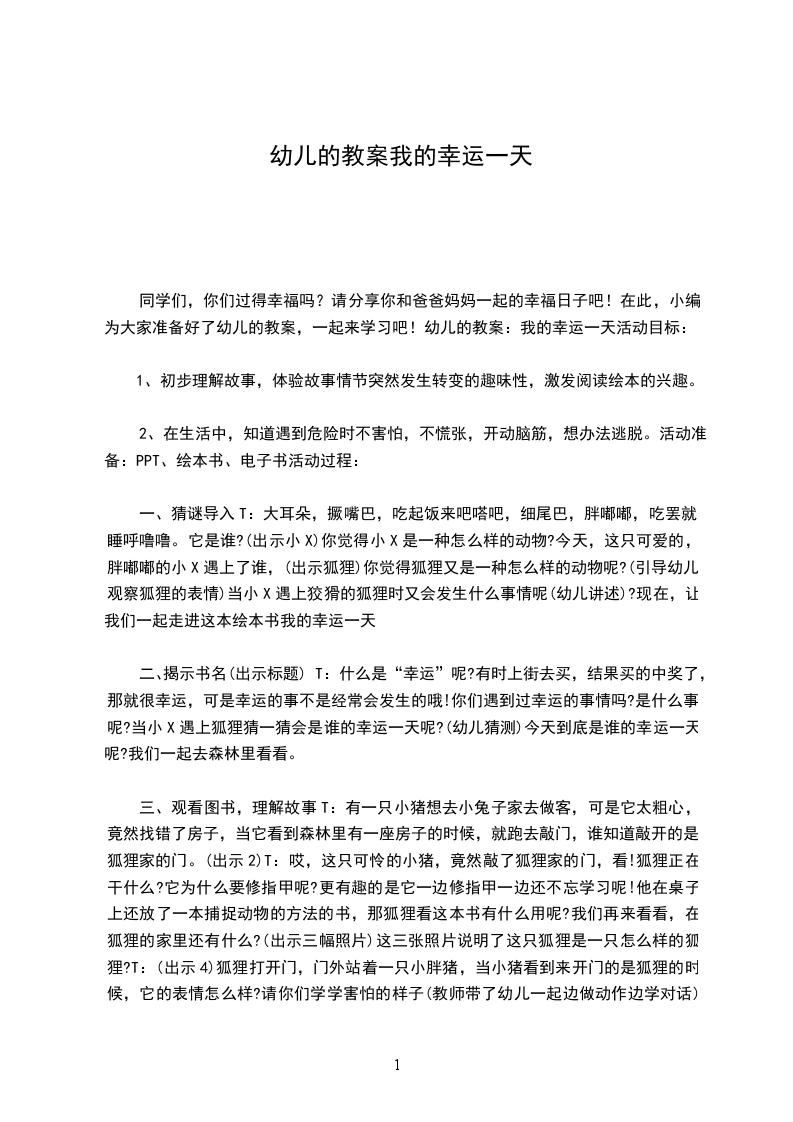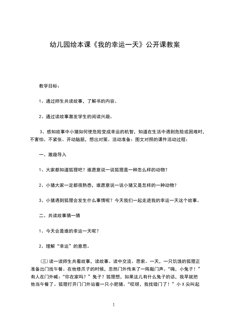 (三)读一读师生共看故事,读故事。读中交流、思索。一天,一只饥饿的狐狸正准备出门找午餐。在他修爪子的时候,忽然门外传来了一阵敲门声。“嗨,小兔子!”有人在门外喊:“你在家吗?”兔子?狐狸想,如果这儿有什么兔子的话,我早就把他当午餐了。狐狸打开门门外站着一只小肥猪。“哎呀,我找错门了!”小X尖叫起来。“啊,没错,”狐狸喊着,“你找的正是地方!”他一把夹住小X,使劲地把他拖了进来。“这真是我的幸运的一天!”狐狸大声叫道,“什么时候午餐竟然自己送上门来了!”“对不起,小子,”狐狸说,“这可不是一般的午餐呐,这是一顿烤猪肉我的美味大餐!现在,就请你到烤锅里去吧!”看到这里,你觉得是谁幸运的一天?小X被狐狸吃了吗?(自由发言)那究竟会怎么样呢?我们接着来看故事。挣扎也没有用了。“好吧,”小X叹了口气,“听你的安排吧。可是,我有一件事情要说。”“什么事?”狐狸吼道。“恩,你知道,我是一只猪,而是猪是非常脏的。难道你就不想给我洗洗澡吗?想一想吧,狐狸先生。”“恩,”狐狸自言自语道,“他是很脏。”于是,狐狸开始忙起来了:他捡树枝,他生火,他拎水。然后,他给小X痛痛快快地洗了个澡。“你真是个令人害怕的家伙。”小X说。狐狸说:“现在你是全村最干净的小X了。给我安静地呆着!”小X想出了好办法,可洗干净后,是不是他就要被吃掉呢?还是想出了其他的办法?我们继续往下看。“好吧,”小X叹了口气,“听你的安排吧。可是”“可是什么?”狐狸吼道。“恩,你知道,我是一只非常小的猪。难道你就不想喂饱我,让自己吃得更过瘾一点吗?想一想吧,狐狸先生。”“恩,”狐狸自言自语道,“他确实小了点。”于是,狐狸开始忙起来了:他摘西红柿,他做通心粉,他烤小甜饼。然后,他给小X吃了一顿丰盛的午餐。“你真是个令人害怕的厨师!”小X说。“好了,”狐狸说,“你现在是全村最肥的小X了。给我进烤锅吧!”“好吧,”小X叹了口气,“听你的安排。可是”“可是,可是,可是什么?”狐狸叫道。“恩,你知道,我是一只勤劳的猪,所以我的肉特别硬。难道你就没有想过给我按摩一下,让自己吃上更嫩一点的烤肉吗?想一想吧,狐狸先生。”“嗯,”狐狸自言自语道,“肉嫩一点当然更合我的口味啦!”于是,狐狸又开始忙起来,他先推推这儿,又拉拉那儿。他把小X从头到尾捏了又敲。“这真是令人害怕的按摩。”小X说。“不过,”小X接着说,“这些日子我确实工作得很辛苦,我的背都僵硬了。你能再用点力气吗,狐狸先生?再多用一点点力气就好了。哦,可以了,可以了。现在请往左边用点力气。”小猪又想出了什么办法?(说一说)这些办法的效果会怎么样呢?我们再往下看故事。“狐狸先生,你在哪儿?”可是,狐狸先生再也听不见了他累昏过去了。连抬抬手指头的力气都没有了,更别说烤猪肉啦!狐狸为什么会晕过去?说明小猪怎么样?“可怜的狐狸先生,”小猪叹口气,“他忙了整整一天!”然后,村里最干净、最肥、最嫩的小猪,拿着剩下来的小甜饼飞快地跑回家去。“多么舒服的澡!多么丰盛的午餐!多么惬意的按摩!”小猪叫起来,“这真是我最幸运的一天!”故事结束了,你觉得最后是谁幸运的一天?为什么狐狸幸运的一天会变成小猪幸运的一天?