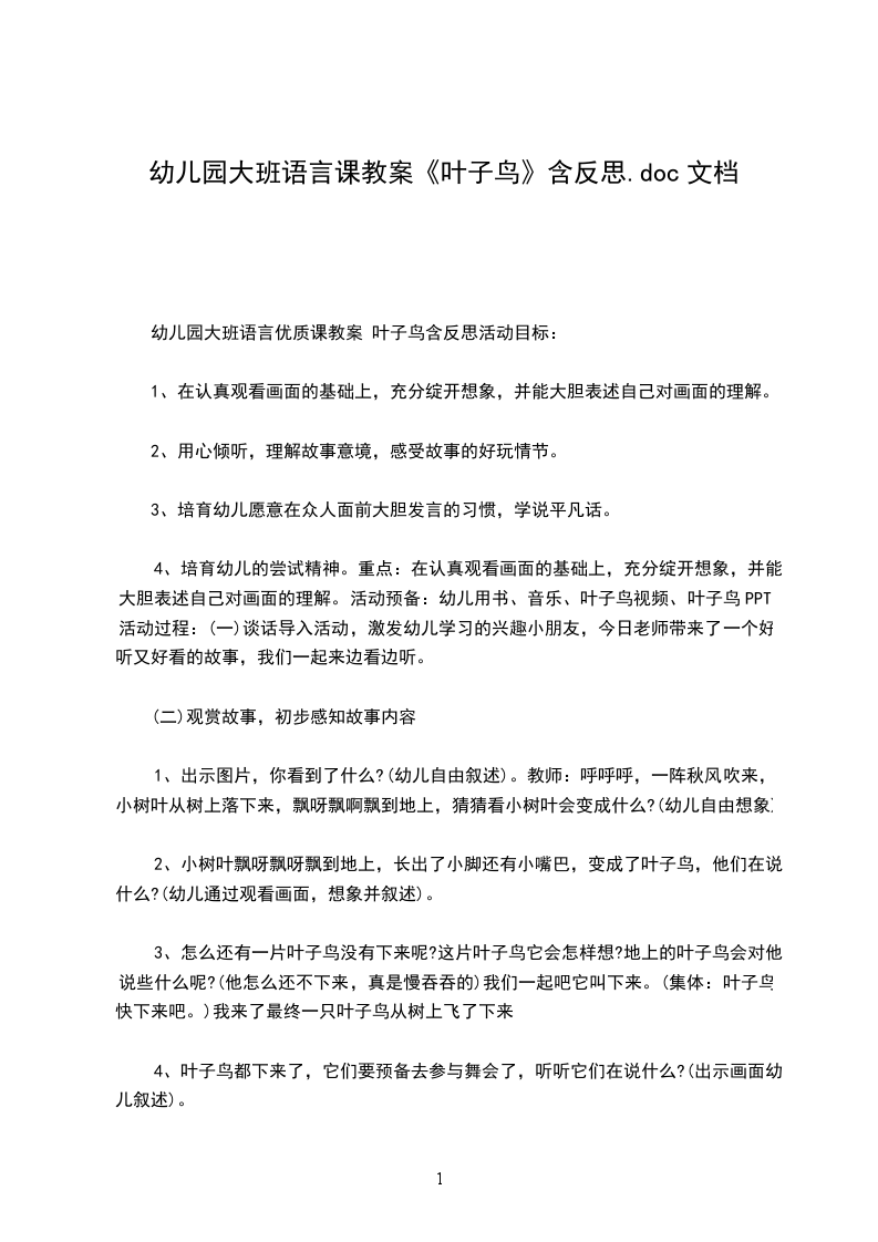 六、活动延伸:鼓舞幼儿用绘画的形式仿编故事内容,表现落叶、背景以及彩色的小鸟,并用童话中的句型叙述:树叶飞呀飞,飞过__,飞着飞着,树叶变成了_色的鸟。教学反思在此次活动中幼儿通过表演故事,亲身融入到为别人着想的情境中,并能积极主动的加入自己的想法。这说明幼儿最大限度的发挥了他们的主动性和思维能力。通过幼儿的争论、表演过程,激发了幼儿的学习兴趣,提高了理解能力。但教师没能参与到表演中,削减了教师与幼儿的互动。教学活动应当多些教师与幼儿的互动、幼儿与幼儿的互动,才能达到更好的效果。