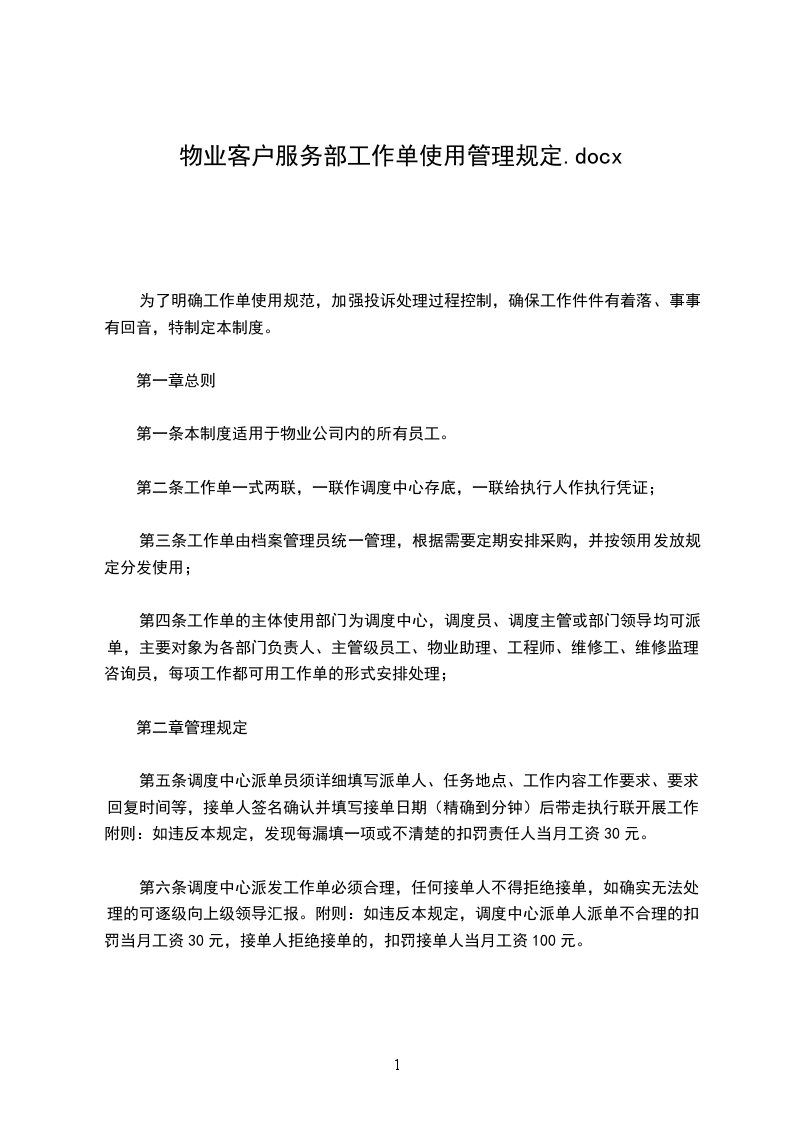 第四条工作单的主体使用部门为调度中心,调度员、调度主管或部门领导均可派单,主要对象为各部门负责人、主管级员工、物业助理、工程师、维修工、维修监理、咨询员,每项工作都可用工作单的形式安排处理;