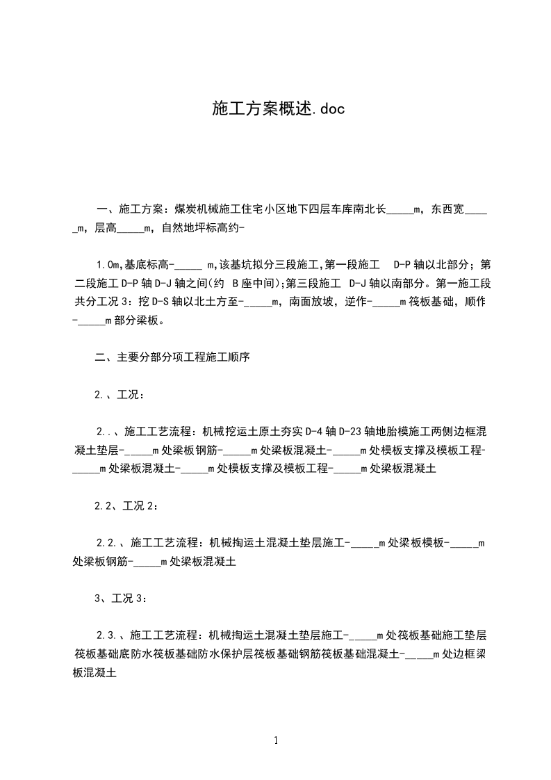 一、施工方案:煤炭机械施工住宅小区地下四层车库南北长_____m,东西宽_____m,层高_____m,自然地坪标高约-