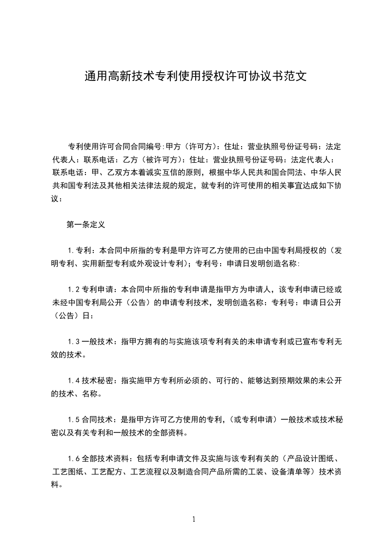 1.5合同技术:是指甲方许可乙方使用的专利,(或专利申请)一般技术或技术秘密以及有关专利和一般技术的全部资料。