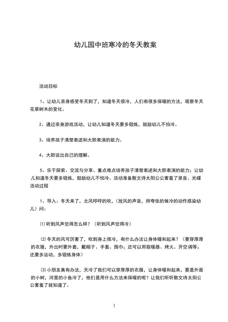 2、通过亲身游戏活动,让幼儿知道冬天要多锻炼,鼓励幼儿不怕冷。