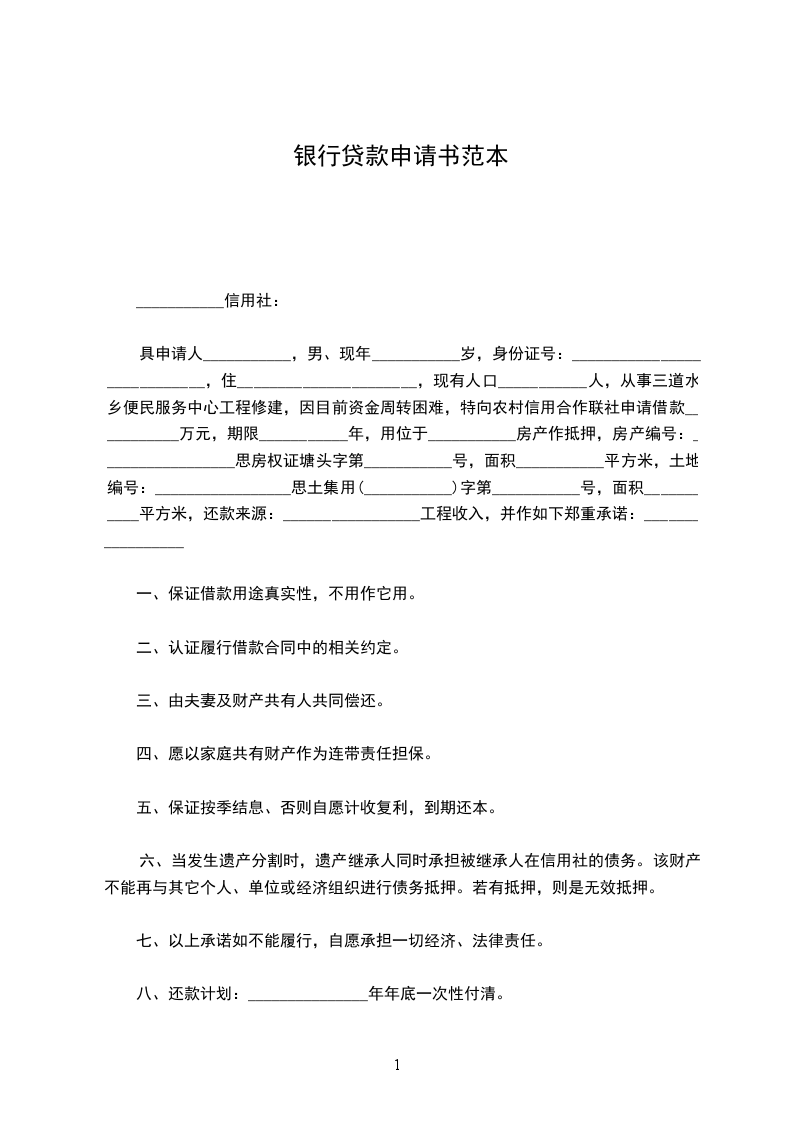 具申请人___________,男、现年___________岁,身份证号:____________________________,住______________________,现有人口___________人,从事三道水乡便民服务中心工程修建,因目前资金周转困难,特向农村信用合作联社申请借款___________万元,期限___________年,用位于___________房产作抵押,房产编号:_________________思房权证塘头字第___________号,面积___________平方米,土地编号:_________________思土集用(___________)字第___________号,面积___________平方米,还款来源:_________________工程收入,并作如下郑重承诺:_________________