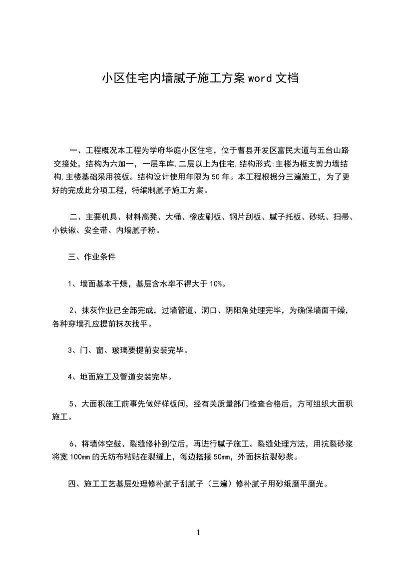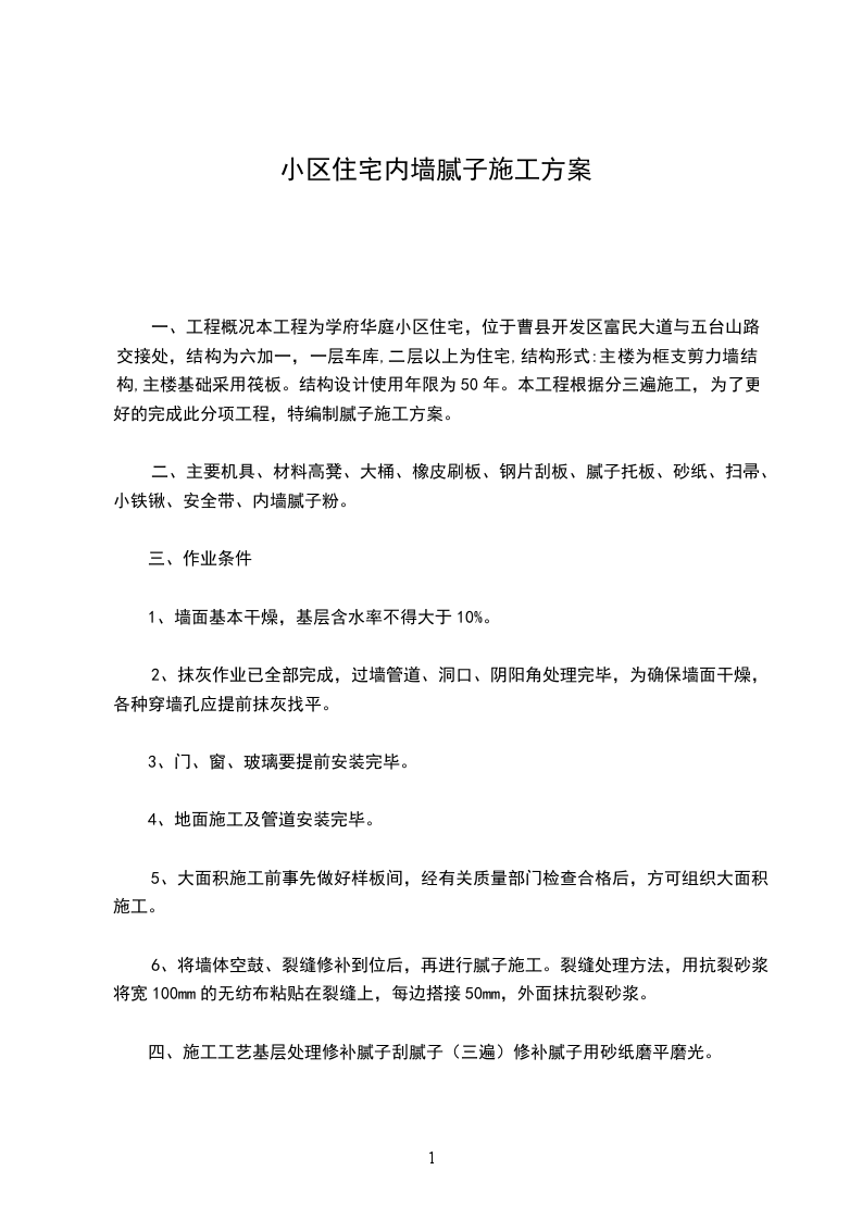 一、工程概况本工程为学府华庭小区住宅,位于曹县开发区富民大道与五台山路交接处,结构为六加一,一层车库,二层以上为住宅,结构形式:主楼为框支剪力墙结构,主楼基础采用筏板。结构设计使用年限为50年。本工程根据分三遍施工,为了更好的完成此分项工程,特编制腻子施工方案。