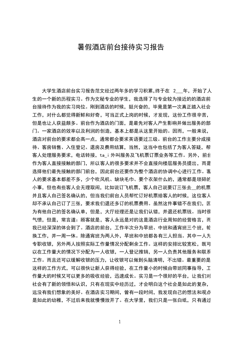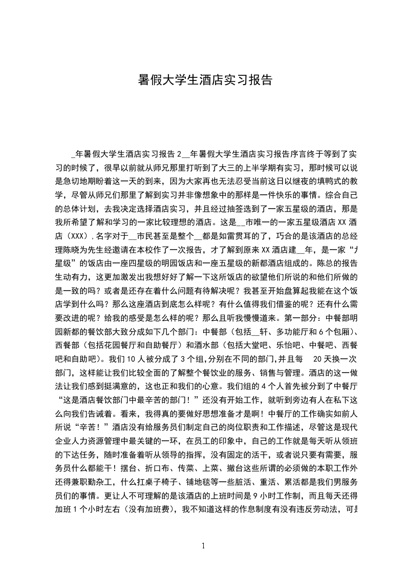 _年暑假大学生酒店实习报告2__年暑假大学生酒店实习报告序言终于等到了实习的时候了,很早以前就从师兄那里打听到了大三的上半学期有实习,那时候可以说是急切地期盼着这一天的到来,因为大家再也无法忍受当前这日以继夜的填鸭式的教学,尽管从师兄们那里了解到实习并非像想象中的那样是一件快乐的事情。综合自己的总体计划,去我决定选择酒店实习,并且经过抽签选到了一家五星级的酒店,那是我所希望了解和学习的一家比较理想的酒店。这是__市唯一的一家五星级酒店XX酒店(XXX),名字对于__市民甚至是整个__都是如雷贯耳的了,巧合的是该酒店的总经理陈晓为先生经邀请在本校作了一次报告,才了解到原来XX酒店建__年,是一家“九星级”的饭店由一座四星级的明园饭店和一座五星级的新都酒店组成的。陈总的报告生动有力,这更加激发出我想好好了解一下这所饭店的欲望他们所说的和他们所做的是一致的吗?或者是还存在着什么问题有待解决呢?我甚至开始盘算起我能在这个饭店学到什么吗?那么这座酒店到底怎么样呢?有什么值得我们借鉴的呢?还有什么需要改进的呢?给我的感受是怎么样的呢?那么且听我慢慢道来。第一部分:中餐部明园新都的餐饮部大致分成如下几个部门:中餐部(包括__轩、多功能厅和6个包厢)、西餐部(包括花园餐厅和自助餐厅)和酒水部(包括大堂吧、乐怡吧、中餐吧、西餐吧和自助吧)。我们10人被分成了3个组,分别在不同的部门,并且每20天换一次部门,这样能让我们比较全面的了解整个餐饮业的服务、销售与管理。酒店的这一做法让我们感到挺满意的,这也正和我们的心意。我们组的4个人首先被分到了中餐厅“这是酒店餐饮部门中最辛苦的部门!”还没有开始工作,就听到旁边有人在私下这么向我们告诫着。看来,我得真的要做好思想准备才是啊!中餐厅的工作确实如前人所说“辛苦!”酒店没有给服务员们制定自己的岗位职责和工作描述,尽管这是现代企业人力资源管理中最关键的一环,在员工的印象中,自己的工作就是每天听从领班的下达任务,随时准备着听从领导的指挥,没有固定的活干,或者说只要有需要,服务员什么都能干!摆台、折口布、传菜、上菜、撤台这些所谓的必须做的本职工作外还得兼职勤杂工,什么扛桌子椅子、铺地毯等一些脏活、重活、累活都是我们男服务员们的事情。更让人不可理解的是该酒店的上班时间是9小时工作制,而且每天还得加班1个小时左右(没有加班费),我不知道这样的作息制度有没有违反劳动法,可是作为一名有血有肉的人来说都有自己的一个最低的底线,因为人毕竟不是一台机器,可以用来随心所欲地使用。刚开始工作的那三天确实令人叫苦不迭啊,每天除了干活还是干活,最受委屈得要算是脚了,每天9小时的站立使得双脚产生了严重抗议,下班的第一件事就是想找个地方坐下了休息一下。令人向往的人性化管理和残酷的实际之间的差距由此可见一斑。另一件令我感到尴尬的事是__轩的服务员制服真是简单得可以,由于酒店没有空余的服装供我这样“高大威猛”的男生穿,所以他们索性让我穿西裤和白衬衫,连马甲和领结也省了,这身打扮使得我这个服务员和客人几乎没有区别,以至有一次我正准备为一个会议提供服务时,却被对方认为是来参加会议的嘉宾向我致以亲切的问候!员工代表着整个酒店的形象,这是酒店vi设计中的一个很重要的方面,好的员工制服不但能使得员工更加精神从而提高工作效率同时员工制服更体现出一个企业的一种内在的文化,没有文化的企业如同一个人没有了灵魂,那只不过是一具行尸走肉罢了,缺少了士气的企业又何来效益呢?不过令我感到高兴的是,酒店的员工大都都是那样的热情友好,他们并没有因为我们是实习生而对我们冷漠生硬,在劳累之余,同事们的一个甜美的微笑,一句再普通不过的“辛苦了”都会让人感动,看来还是员工自己最能够了解大家的心情,因为他们能站在员工自己角度来看问题,因为他们讲述的是“老百姓的心里话。”这也是酒店上层领导所最缺乏的素质之一!中餐厅的日子就这样一天天结束了,在这些日子我的确学到了不少的东西:除了能学到中式餐饮的服务程序和技巧、粤菜的特点和种类等课堂上所能学到的东西外,更能学到一些课堂上很难学到的东西:如何处理好自己的利益和酒店的利益、如何处理好同事之间的人际关系、如何调整自己的心态,更让我了解到的是作为一个服务员应该具有强烈的服务意识。在一次与某部门经理聊天时,该经理提到了服务意识,我非常赞同他的观点:“服务意识不但是要求服务员有着向客人提供优质服务的观念和愿望,同时应该对自己的同事也具有同样的意识。”是啊,这才是“服务意识”的真正的含义,这才是一个服务员真正的素质的体现。