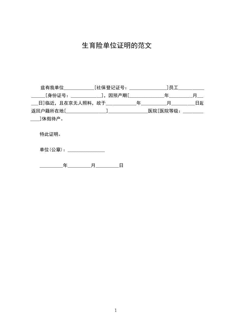 兹有我单位_____________[社保登记证号:________________]员工_________________[身份证号:_____________],因预产期[_______________年__________月______日]临近,且在京无人照料,故于_____________年___________月__________日起返回户籍所在地[_________________]_________________医院[医院等级:_____________]休假待产。