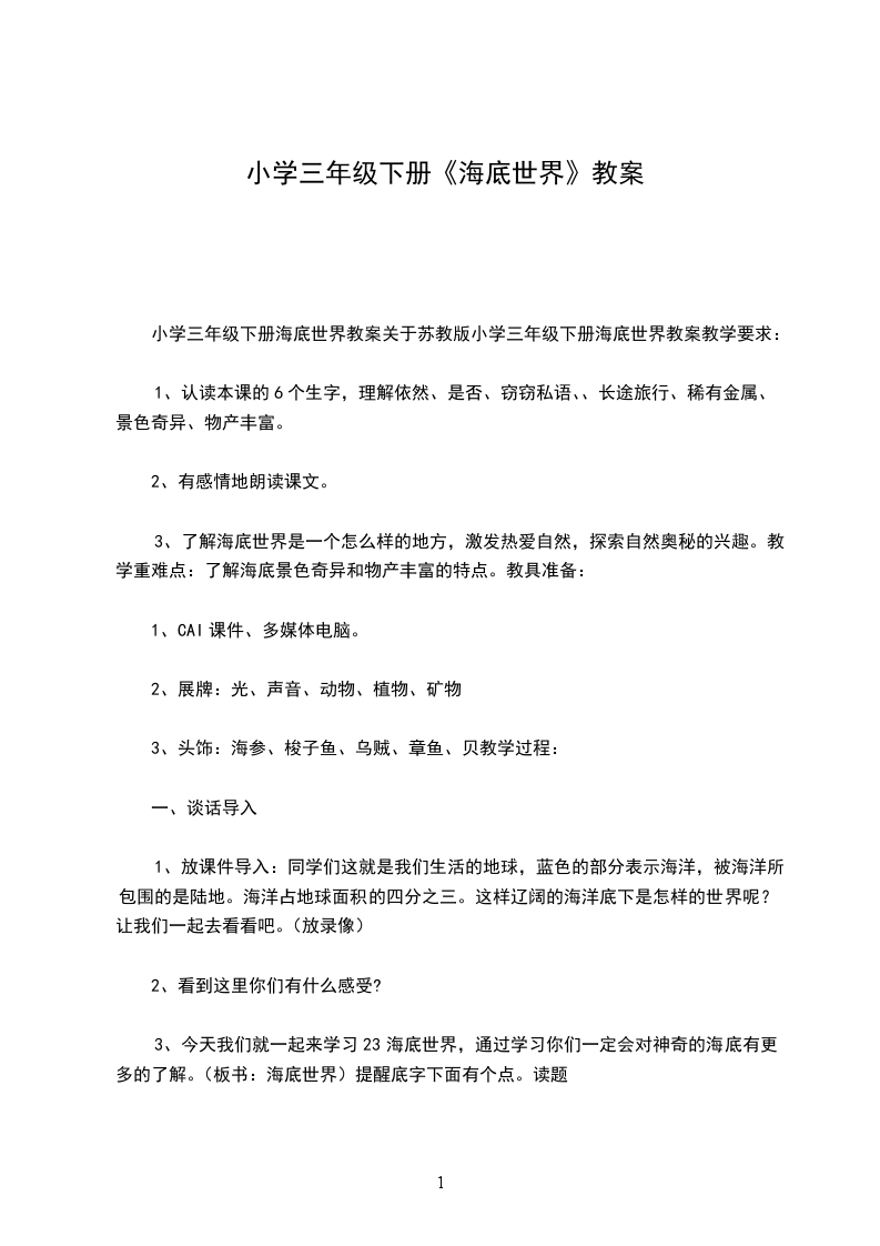 小学三年级下册海底世界教案关于苏教版小学三年级下册海底世界教案教学要求: