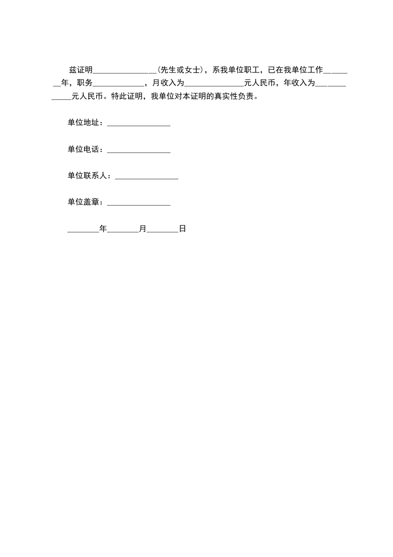 兹证明________________(先生或女士),系我单位职工,已在我单位工作________年,职务_____________,月收入为_______________元人民币,年收入为_____________元人民币。特此证明,我单位对本证明的真实性负责。
