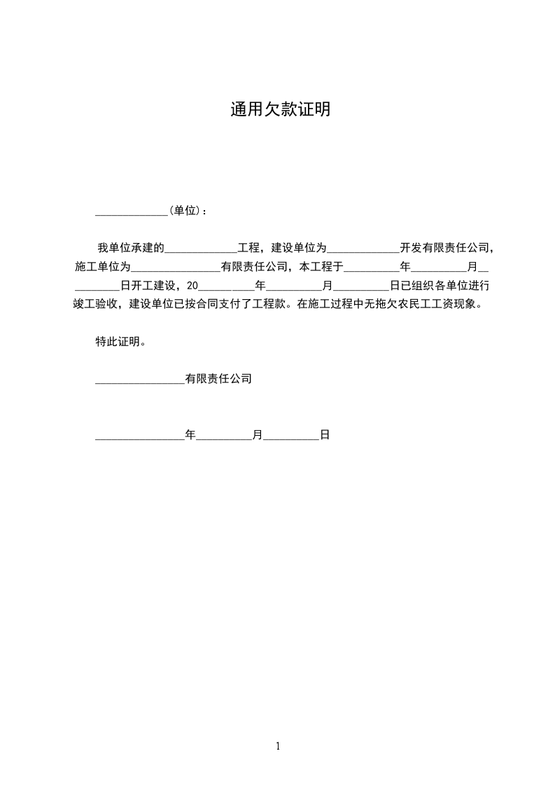 我单位承建的_____________工程,建设单位为_____________开发有限责任公司,施工单位为________________有限责任公司,本工程于__________年__________月__________日开工建设,20__________年__________月__________日已组织各单位进行竣工验收,建设单位已按合同支付了工程款。在施工过程中无拖欠农民工工资现象。