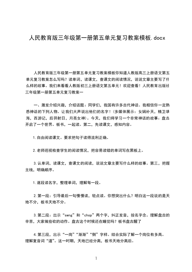 人民教育版三年级第一册第五单元复习教案模板你知道人教版高三上册语文第五单元复习教案怎么写吗?读单词,读课文,查课文的阅读情况,说说文章主要写了什么样的故事。我们来看看人教版初三上册语文第五单元!欢迎查看!人民教育出版社三年级第一册第五单元复习教案一
