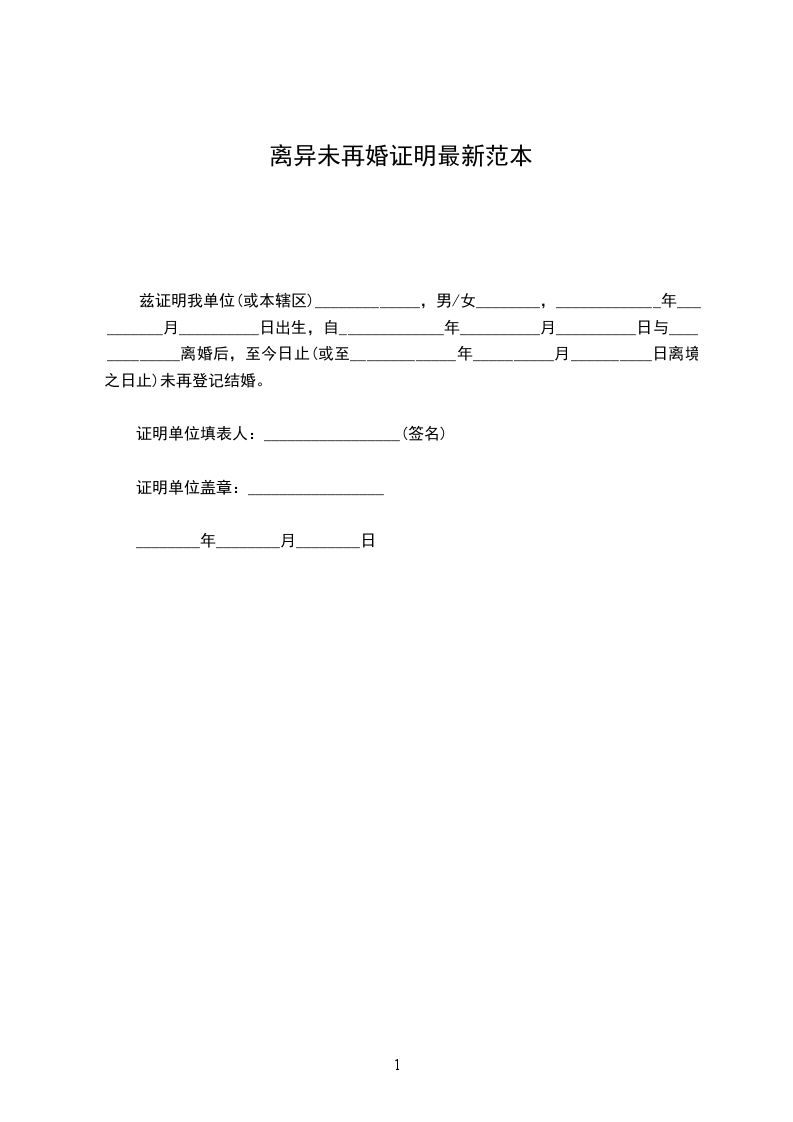 兹证明我单位(或本辖区)_____________,男/女_____,_____________年__________月__________日出生,自_____________年__________月__________日与_____________离婚后,至今日止(或至_____________年__________月__________日离境之日止)未再登记结婚。