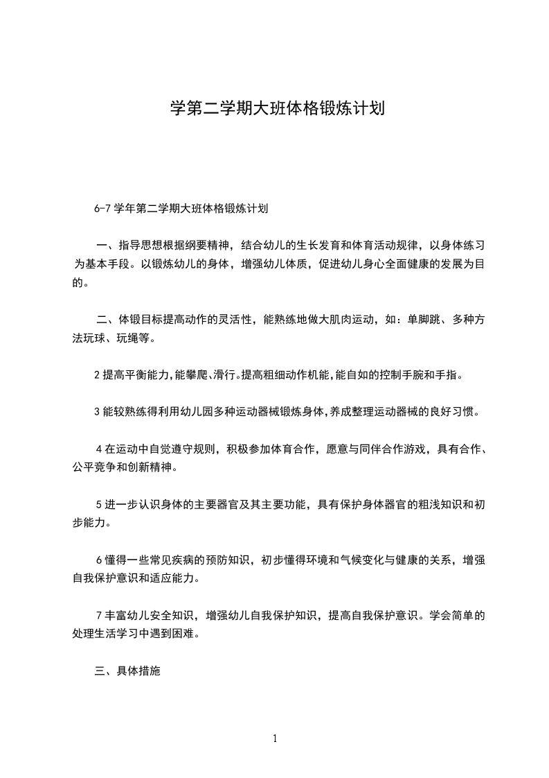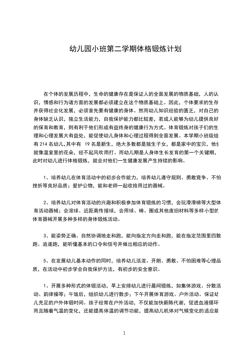一、指导思想在个体的发展历程中,生命的健康存在是保证人的全面发展的物质基础,人的认识,情感和行为诸方面的发展都必须建立在这个物质基础上。因此,个体要求的生存并获得社会化发展,必须首先要有健康的身体。然而幼儿知识经验的匮乏,对自己的身体缺乏认识,独立生活能力,自我保护能力都比较差,若成人能够为幼儿提供良好的保育和教育,则有利于他们形成有益终身的健康行为方式。体育锻炼对孩子们的生理和心理发展大有益处,能促使幼儿身体和心理过程得到全面发展。