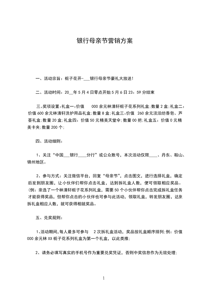 六、奖品详情:礼盒:林XX栀子花系列礼盒;数量2盒;需50人帮拆礼盒;礼盒2:林XX洗护用品礼盒;数量8盒;需00人帮拆礼盒;礼盒3:淡泊坊香皂、芦荟礼盒;数量20盒;需80人帮拆礼盒;礼盒4:精美天堂伞;数量00把;需50人帮拆礼盒;礼盒5:精美卡夹;数量200个;需20人帮拆礼盒;银行母亲节营销策划