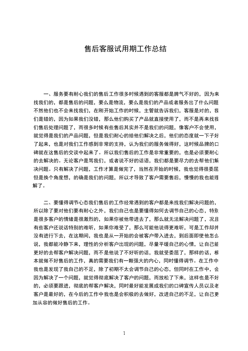 二、要懂得调节心态我们售后的工作经常遇到的客户都是来找我们解决问题的,所以除了要对他们要有耐心之外,我们自己也是要懂得如何去调节自己的心态,特别是很多客户的情绪是很激烈的,如果你被他带进去了,那么就无法解决问题了,况且有些客户还说话特别的难听,如果你难受了,那么可能他说得更难听,可是工作却并没有进行下去,在这期间,我也是从一开始的会被客户带入进去,到后面即使他怎么说,我都能冷静下来,理性的分析客户出现的问题,尽量平缓自己的心情,让自己能更好的去帮客户解决问题,而不是他说了不好听的话,我就受委屈了,那样的话,根本就做不好售后的工作,真的需要我们有一颗强大的内心,同时懂得调节。在工作中,我也是发现了我自己的不足,除了初期不太会调节自己的心态,但同时在工作中,会因为解决了一个问题,就觉得彻底解决了客户的问题,而放松了下来,这样也是不好的,必须要跟进,彻底的帮客户解决,同时最好能发展成我们的口碑宣传人员以及老客户是最好的,在今后的工作中我也是会积极的去做好,改进自己的不足,让自己更加从容的做好售后的工作。