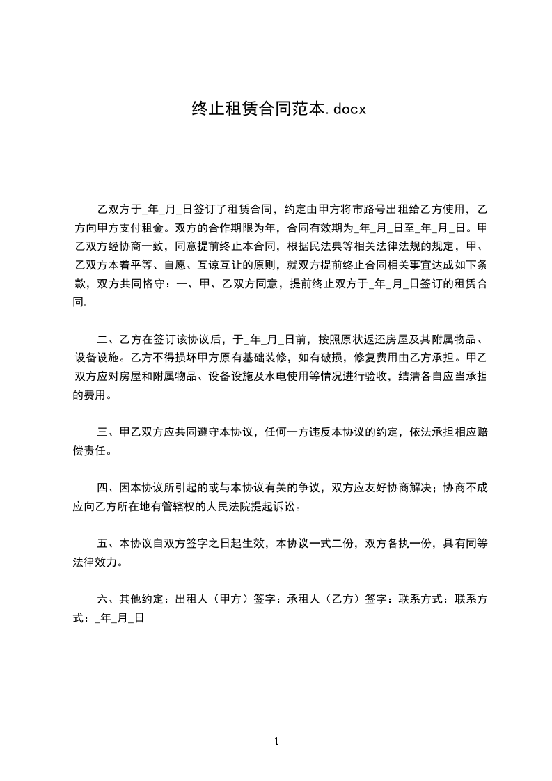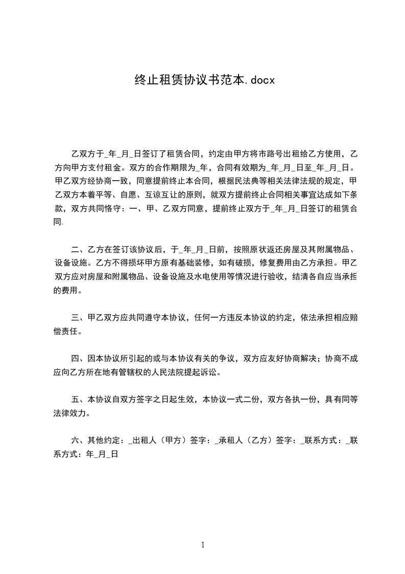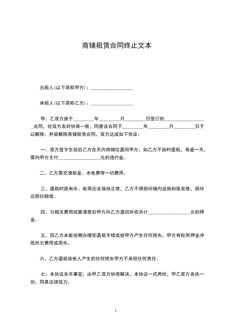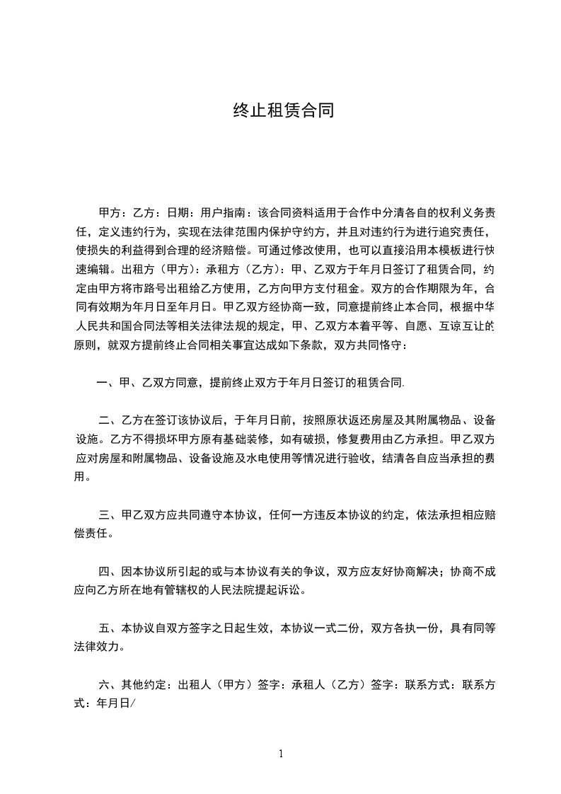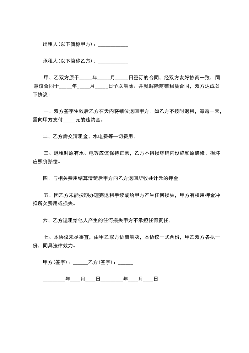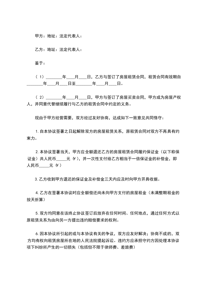 5.双方均同意在该终止协议签订后放弃在任何时间、任何地点,通过任何方式以原租赁关系为由向另一方提出违约赔偿要求的权利。