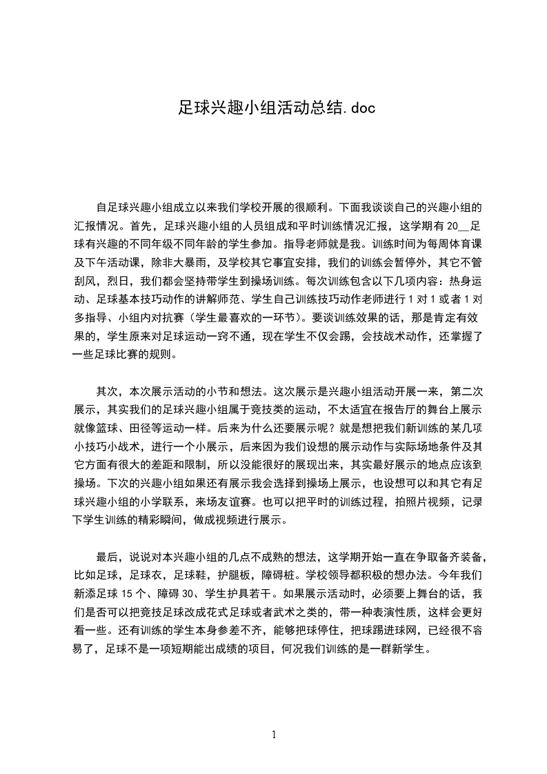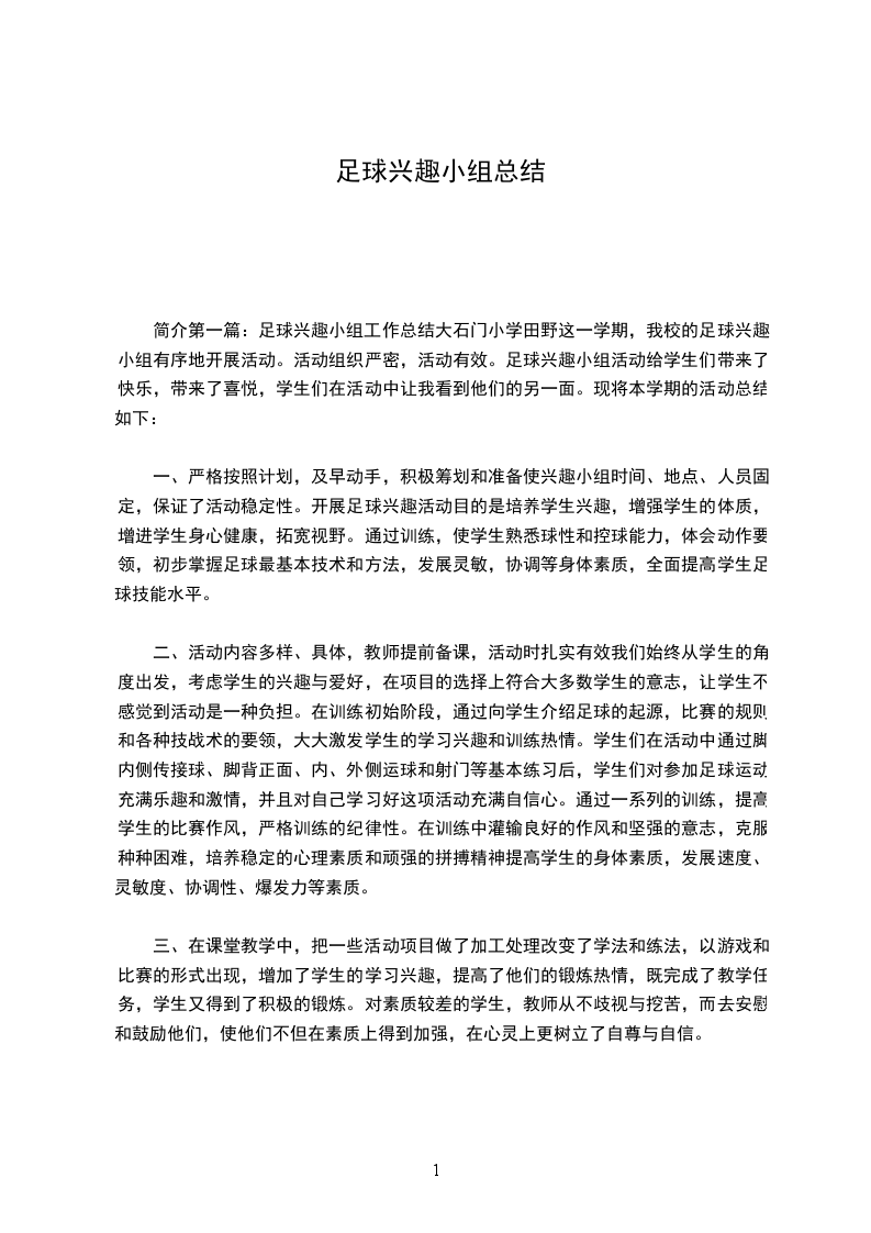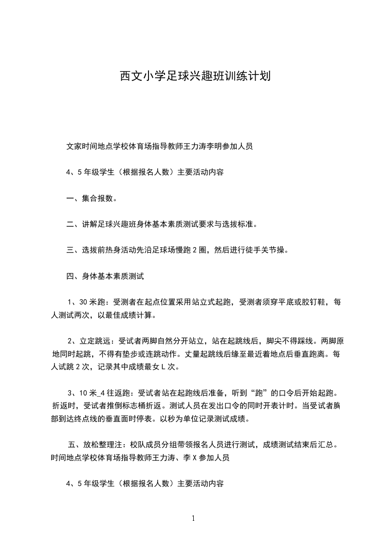 (2)训练的内容安排把本学期的训练分为“四个阶段”来进行训练。第一阶段:第二周至第八周为基本素质和技术的练习,(即:踢、停、颠、顶、运、抢、假动作、耐力素质等)星期一:颠球练习(各部位,以脚为主)星期二:踢球练习(以脚内、外侧为主)星期三:停球练习(以脚内侧、脚底、大腿为主)星期四:运球、抢截球、和假动作练习(以足球游戏为主来完成)第二阶段:第九周至第十四周为战术练习星期一:进攻战术(个人:以传球、射门、运球过人、接球、掷界外球、摆脱、跑位为主的练习)星期二:局部战术(以二过