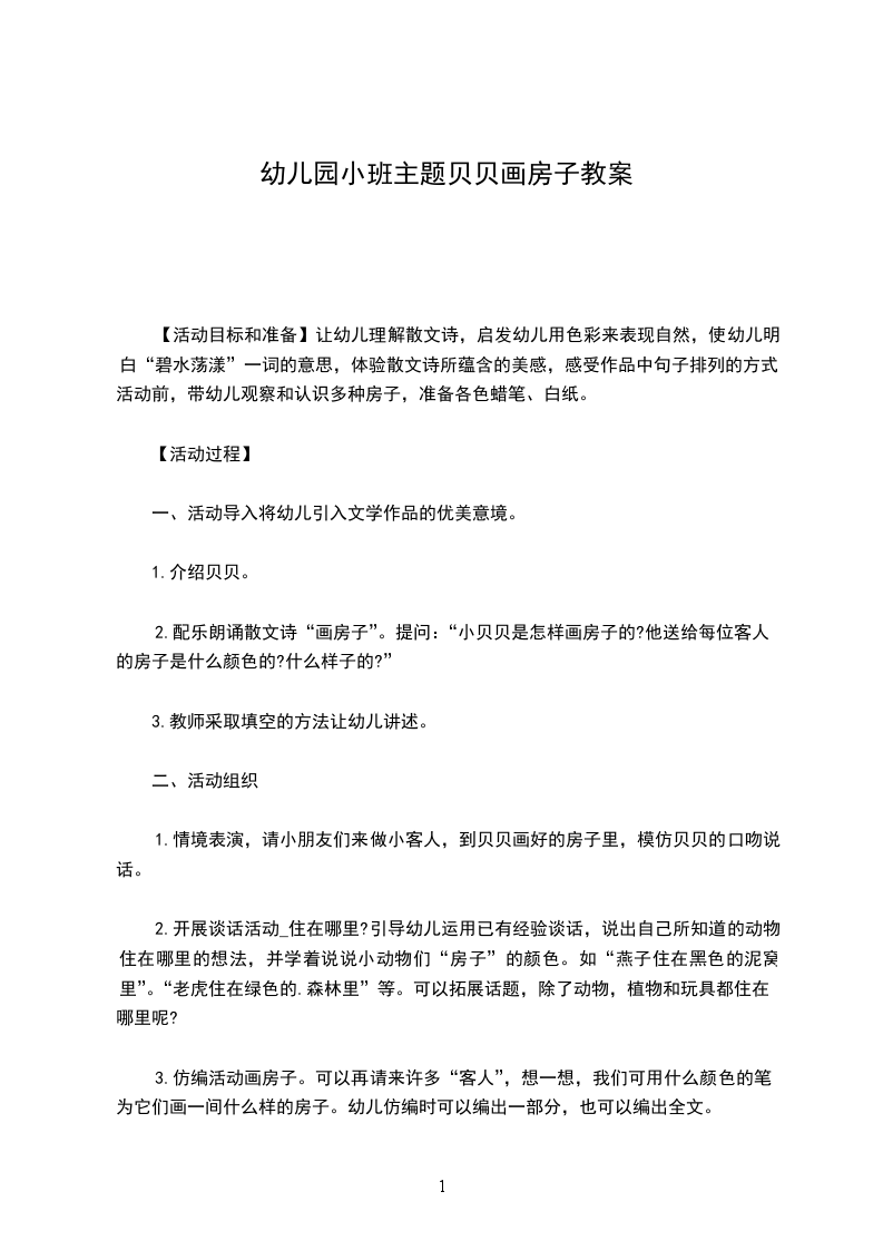 【活动目标和准备】让幼儿理解散文诗,启发幼儿用色彩来表现自然,使幼儿明白“碧水荡漾”一词的意思,体验散文诗所蕴含的美感,感受作品中句子排列的方式。活动前,带幼儿观察和认识多种房子,准备各色蜡笔、白纸。