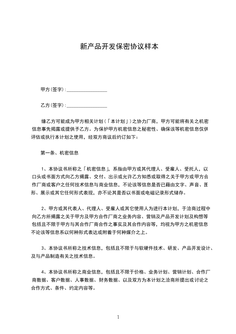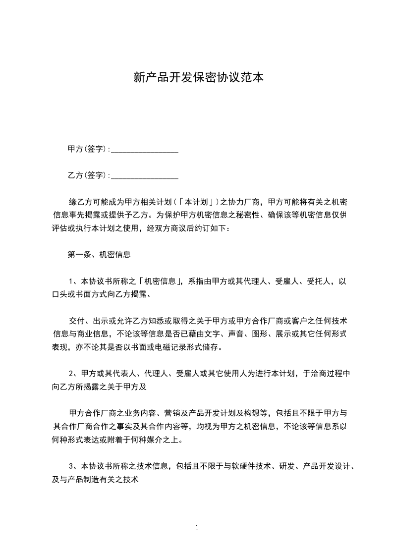 新产品开发保密协议范本