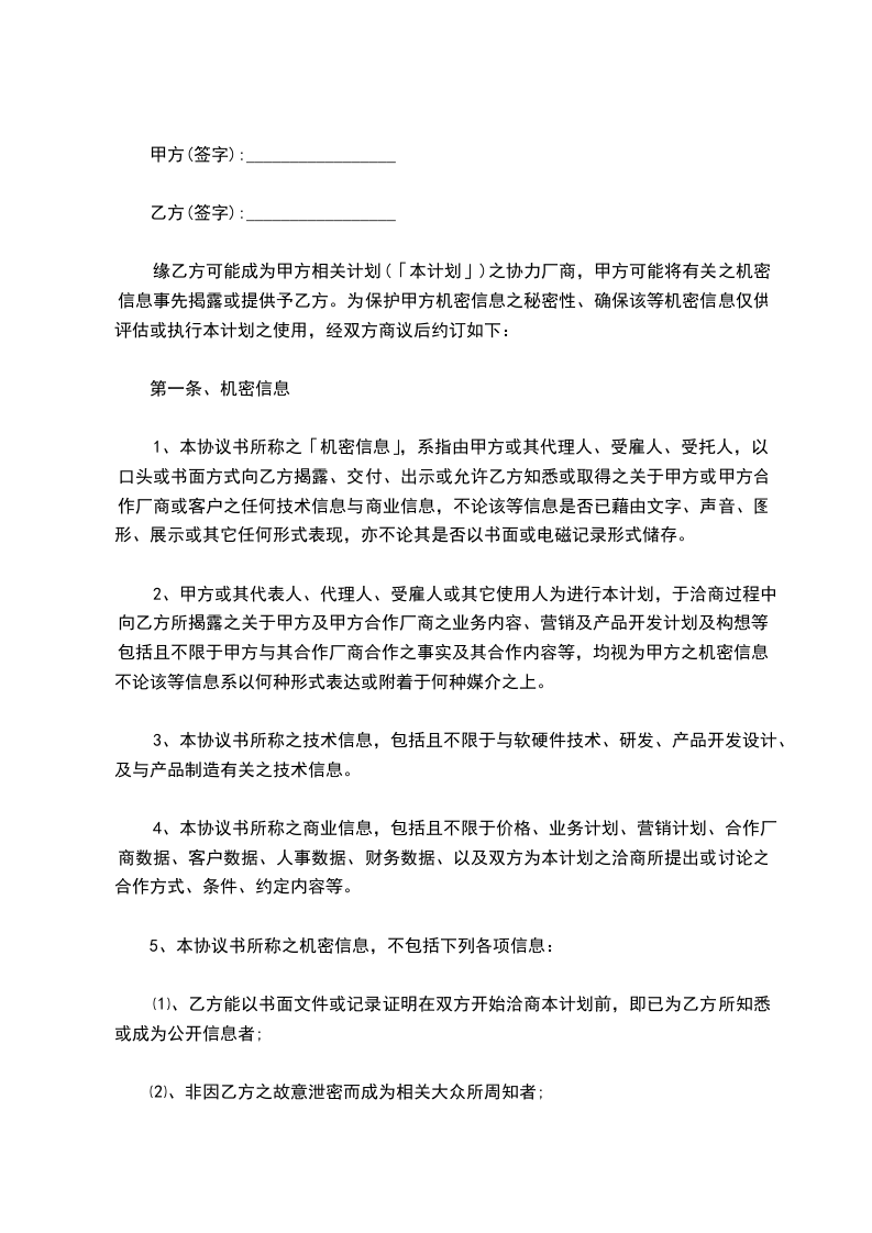 缘乙方可能成为甲方相关计划(「本计划」)之协力厂商,甲方可能将有关之机密信息事先掲露或提供予乙方。为保护甲方机密信息之秘密性、确保该等机密信息仅供评估或执行本计划之使用,经双方商议后约订如下: