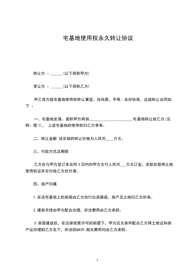 一、甲方同意将位于面积________平方米的土地使用权及上盖有一层房产有偿转让给乙方。