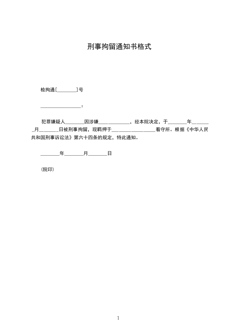 犯罪嫌疑人________因涉嫌_____________,经本院决定,于________年________月________日被刑事拘留,现羁押于__________________看守所。根据《中华人民共和国刑事诉讼法》第六十四条的规定,特此通知。