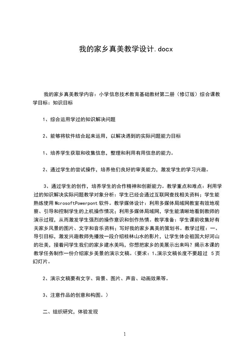 3、通过学生的创作,培养学生的合作精神和创新能力。教学重点和难点:利用学过的知识解决实际问题教学对象分析:学生已经会通过互联网查找相关资料;学生能熟练使用McrosoftPowerpont软件。教学媒体设计:利用多媒体局域网教室有效地观察、引导和控制学生的上机操作情况;利用多媒体局域网,学生能清晰地看到教师的演示过程,从而激发学生强烈的操作意识和创作热情。教学准备:学生课前收集好有关家乡风景的图片、文字和音乐资料;写好我的家乡真美的策划书。教学过程:一、导引目标,激发兴趣教师先播放一段介绍桂林山水的影片,让学生体会祖国大好河山的壮美,接着问学生我们的家乡建水美吗,你想把家乡的美展示出来吗?揭示本课的教学任务制作一份介绍家乡美景的演示文稿。(要求:1、演示文稿长度不要超过5页幻灯片。