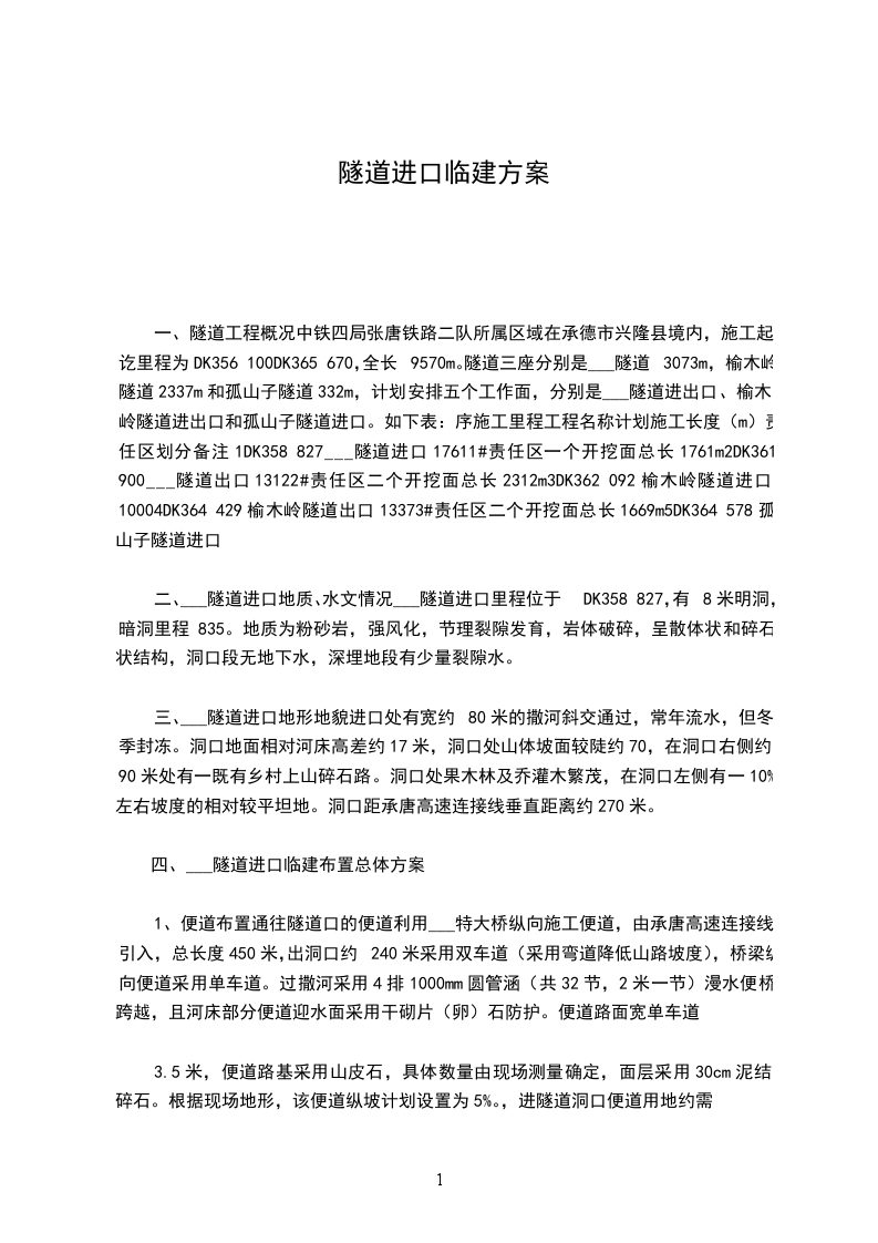 五、先期开工部位打算___隧道进口计划先期开工。故考虑先租用1台200KW发电机和10m3空压机1台,挖掘机和装载机各一台。待设计图纸基本确定后(及时与设计院沟通),则立即进行明洞部位施工。同时进行洞口临建施工。
