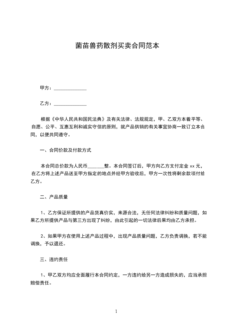 菌苗兽药散剂代销合同