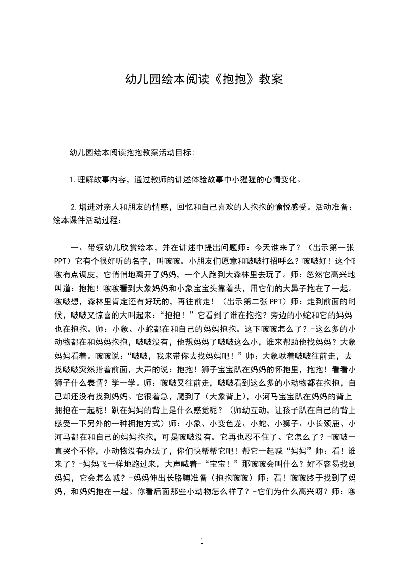 (四)以游戏大家来抱抱结束活动幼儿与教师手拉手围成一个圈,音乐响起来的时候手拉手绕圈走,音乐停下来的时候,小朋友自由选择同伴、老师抱一抱。活动延伸:回家以后与家人抱一抱,对他们表达喜爱之情。反思本次活动中我看到孩子的学习积极性,也能感受到了爱与被爱的情感,活动中我采用了以启发式的提问、观察、语言表达和动作模仿引出活动主题,环环相扣,循序渐进地组织活动。不过观察图片较少,没有充分引导幼儿思考。还有在课前没有及时检查装备,使得课上幼儿在听一听环节幼儿不能欣赏,让幼儿观察小动物们和妈妈宝宝的动作,以及模仿体验感受情感。活动的最后一个环节孩子比较害羞,不敢与其他教师抱抱,整个活动没有体现温馨气氛,教师可以用各种方式体验动物的抱抱。幼儿园小班社会抱抱教案3活动目标