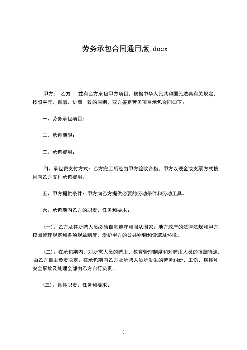 甲方:_乙方:_兹有乙方承包甲方项目,根据中华人民共和国民法典有关规定,按照平等、自愿、协商一致的原则,双方签定劳务项目承包合同如下: