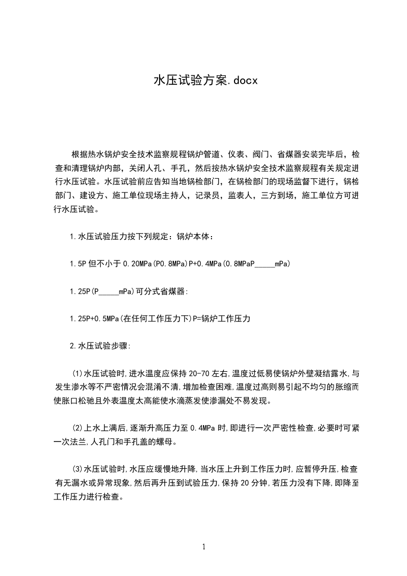 根据热水锅炉安全技术监察规程锅炉管道、仪表、阀门、省煤器安装完毕后,检查和清理锅炉内部,关闭人孔、手孔,然后按热水锅炉安全技术监察规程有关规定进行水压试验。水压试验前应告知当地锅检部门,在锅检部门的现场监督下进行,锅检部门、建设方、施工单位现场主持人,记录员,监表人,三方到场,施工单位方可进行水压试验。