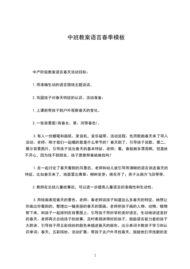 3.用绘画表现春天的景色。老师:春老师说孩子知道这么多春天的特征,她想让你画出你看到的,整理出一幅美丽的春天的图画。老师把孩子画的人物、动物、植物剪下来,和孩子一起排列在背景图上。引导孩子用所学的美好语言,生动地讲述美好的春天。老师再次总结孩子的故事,及时表扬讲得好的孩子,鼓励语言能力差的孩子大胆讲。引导孩子用五彩缤纷的颜色来描述春天的颜色。出示单词卡教孩子学习和认识单词:春天,五彩缤纷。活动扩展:带孩子去户外寻找春天,鼓励他们寻找新的发现。让孩子感受春天给大自然带来的美好,激发孩子保护花草树木的情感。中产阶级教案语言春天2活动目标