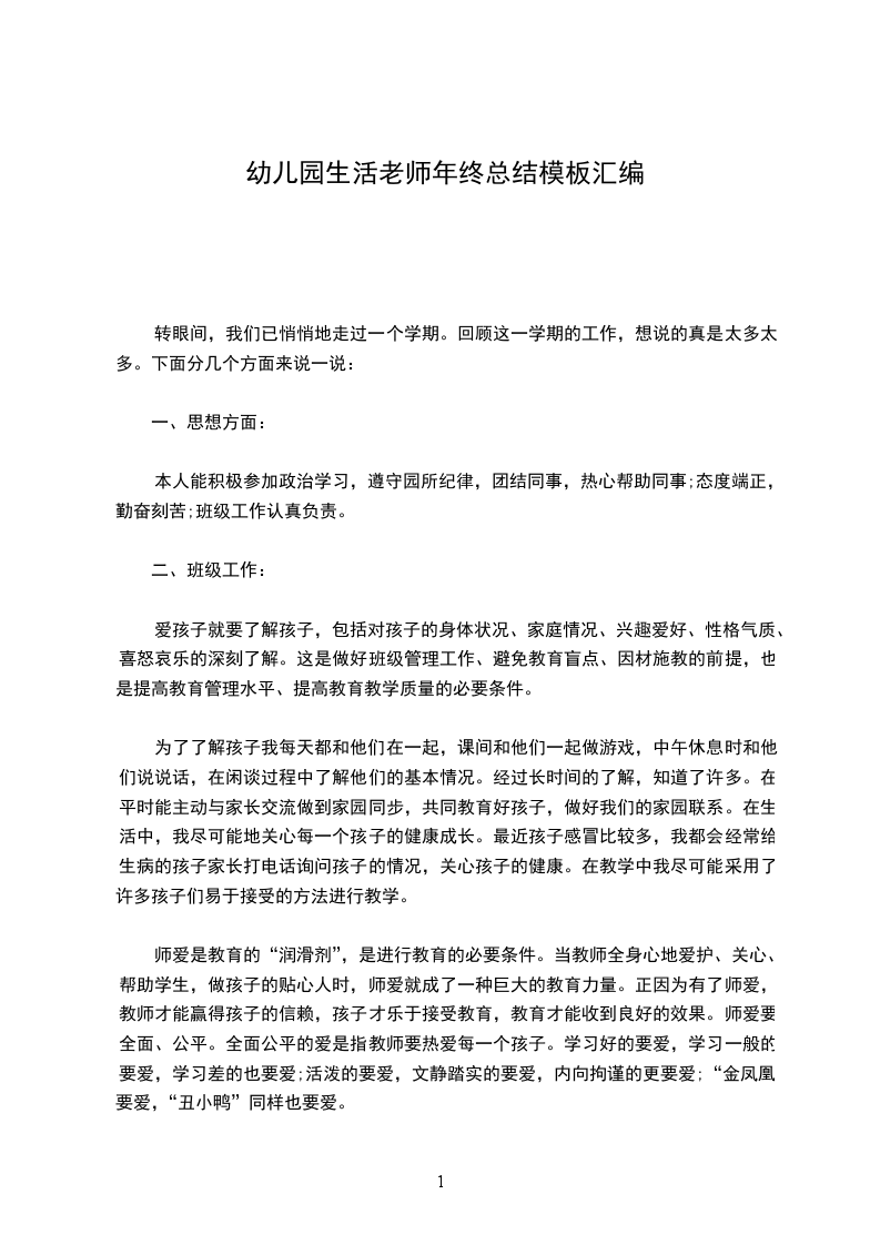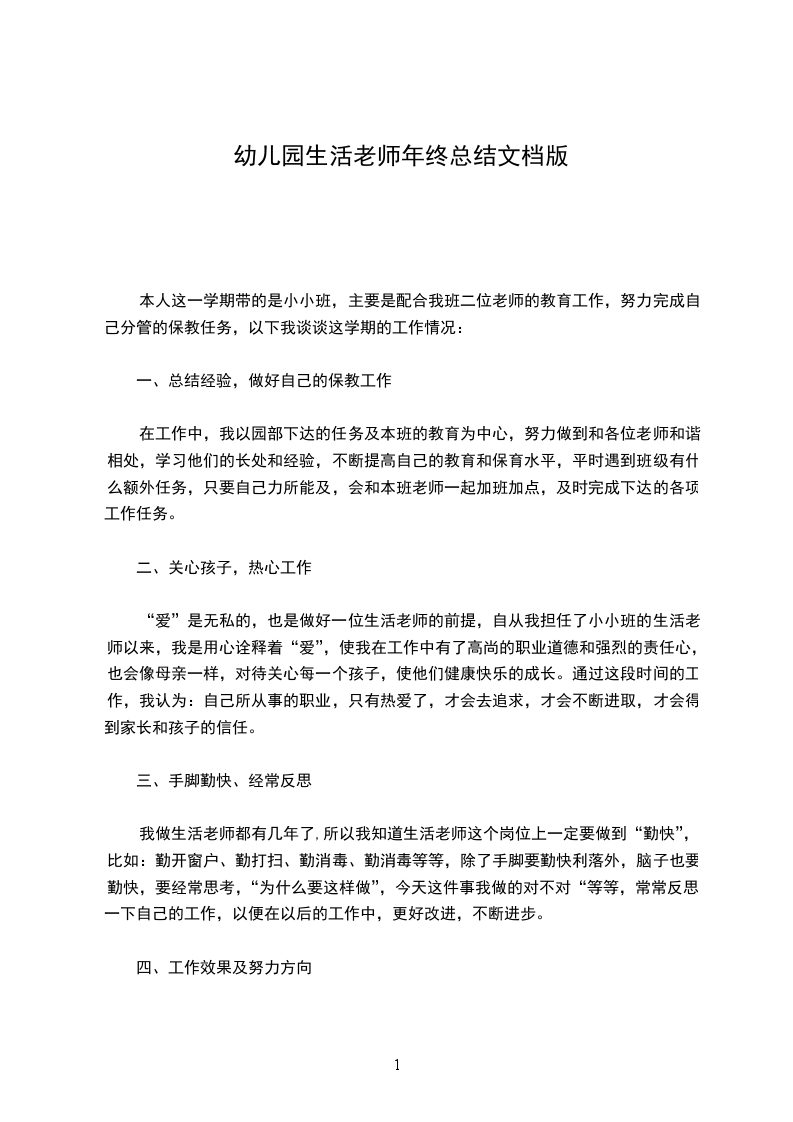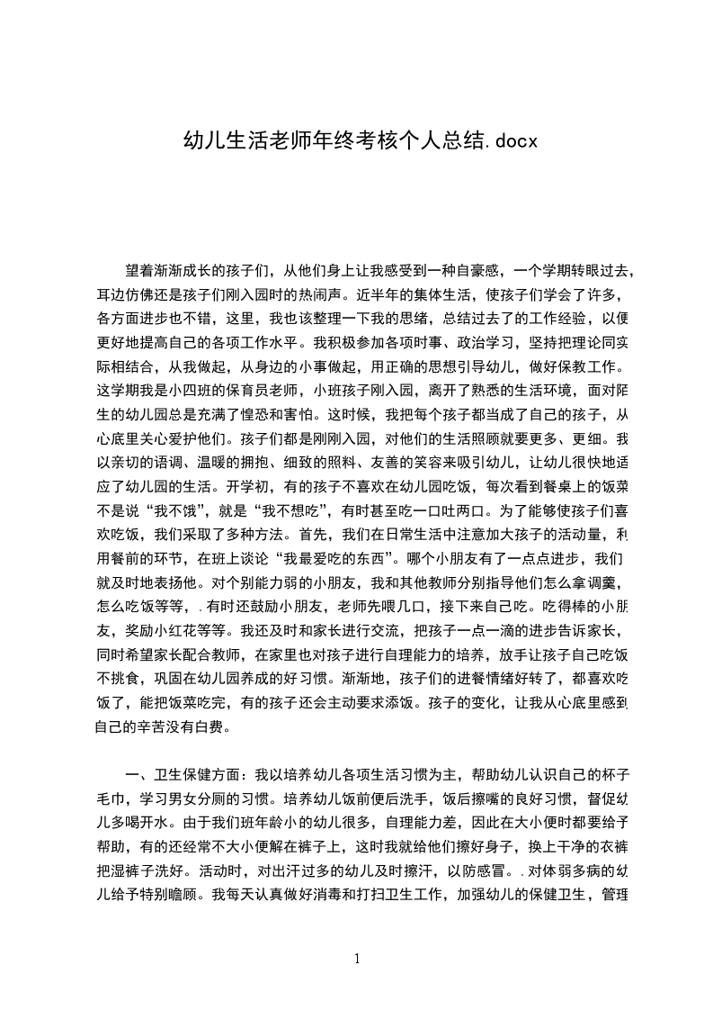 一、卫生保健方面:我以培养幼儿各项生活习惯为主,帮助幼儿认识自己的杯子毛巾,学习男女分厕的习惯。培养幼儿饭前便后洗手,饭后擦嘴的良好习惯,督促幼儿多喝开水。由于我们班年龄小的幼儿很多,自理能力差,因此在大小便时都要给予帮助,有的还经常不大小便解在裤子上,这时我就给他们擦好身子,换上干净的衣裤,把湿裤子洗好。活动时,对出汗过多的幼儿及时擦汗,以防感冒。.对体弱多病的幼儿给予特别瞻顾。我每天认真做好消毒和打扫卫生工作,加强幼儿的保健卫生,管理午睡,做到让每个幼儿都睡着。做好预防幼儿常见疾病的工作,常晒被子、枕头,减少细菌滋生。生活老师对幼儿来说,也是很是很重要的,因为他们的一天生活都由你管理,所以要想成为幼儿的知心朋友,要得到每一位幼儿的信任,需要付出很多的汗水,要用自己的热情和爱心去感染他们。通过半学期的共同生活和学习我与幼儿建立了深厚的感情,听到孩子们开心的笑声,看到他们甜甜的笑脸,我深深地为自己的这份职业感到自豪和骄傲。时光飞逝,本学期的各项工作即将结束,在各级领导和同志们的共同帮助下,尽职尽则地完成了自己的本职工作,下面,我从以下几点方面总结如下:一、政治思想方面:教师是幼儿心中的榜样,在全面推进素质教育的今天,作为教师更应提高自身素质,树立职业道德,以高尚的道德风范去影响幼儿,当好幼儿健康的指导者和引路人。因此,我能够提高自身的职业道德修养和素质,搞好班级的团结,相互配合,努力完成园领导交给的任务。