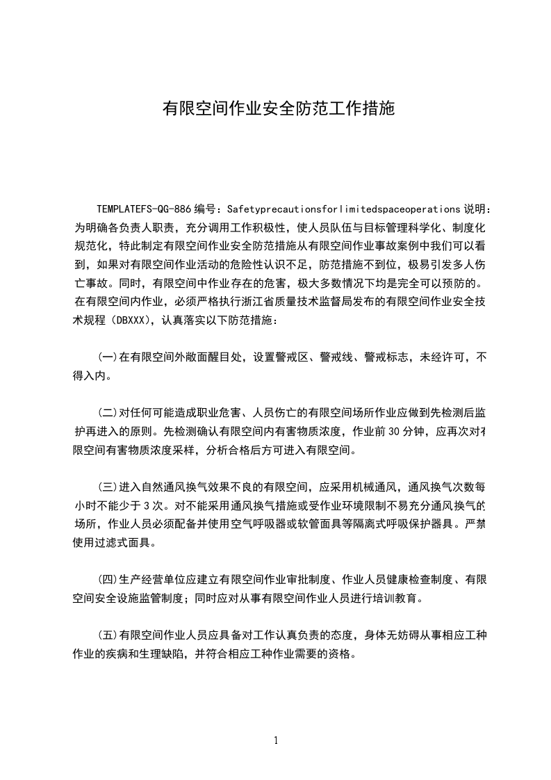 TEMPLATEFS-QG-886编号:Safetyprecautionsforlimitedspaceoperations说明:为明确各负责人职责,充分调用工作积极性,使人员队伍与目标管理科学化、制度化、规范化,特此制定有限空间作业安全防范措施从有限空间作业事故案例中我们可以看到,如果对有限空间作业活动的危险性认识不足,防范措施不到位,极易引发多人伤亡事故。同时,有限空间中作业存在的危害,极大多数情况下均是完全可以预防的。在有限空间内作业,必须严格执行浙江省质量技术监督局发布的有限空间作业安全技术规程(DBXXX),认真落实以下防范措施: