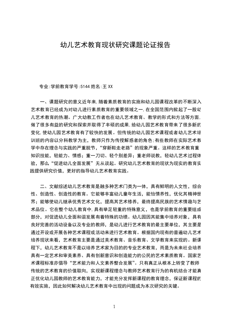 二、文献综述幼儿艺术教育是融多种艺术门类为一体,具有鲜明的人文性,综合性、创造性、创造性的教育。它能够丰富幼儿童年生活,能怡情养性,优化其精神世界;能够使幼儿继承优秀艺术文化,提高其艺术修养,最终提高民族的艺术情趣与艺术品位。它在整个幼儿教育中,具有举足轻重的特殊意义,也是学前教育的重要组成部分,对促进幼儿全面和谐发展有着特殊的功绩。幼儿园因其能集中培养对象,具有良好完善的活动设备以及专业的教师,是幼儿进行艺术教育的最主要单位,其主要是通过开设或开展各种艺术课程或活动来进行艺术教育。根据国内现有的普遍幼儿艺术培养现状来看,艺术教育主要是通过美术教育、音乐教育、文学教育来实现的。新课程下,幼儿艺术教育不是以培养艺术家为目的的专业艺术教育,而是为未来社会培养具有一定艺术和审美素养、具有创新意识和创造能力的公民的艺术素质教育。国家艺术课程标准亦倡导“艺术能力和人文素养整合发展”。只有真正从根本上转变了教师传统的艺术教育的价值取向,实现新课程理念与教师艺术教育行为的有机结合才能真正优化幼儿园教师的艺术教育能力,才能充分发挥新课程的教育理念,保证新课程的有效实施,因此如何解决幼儿艺术教育中出现的问题成为本次研究的关键。