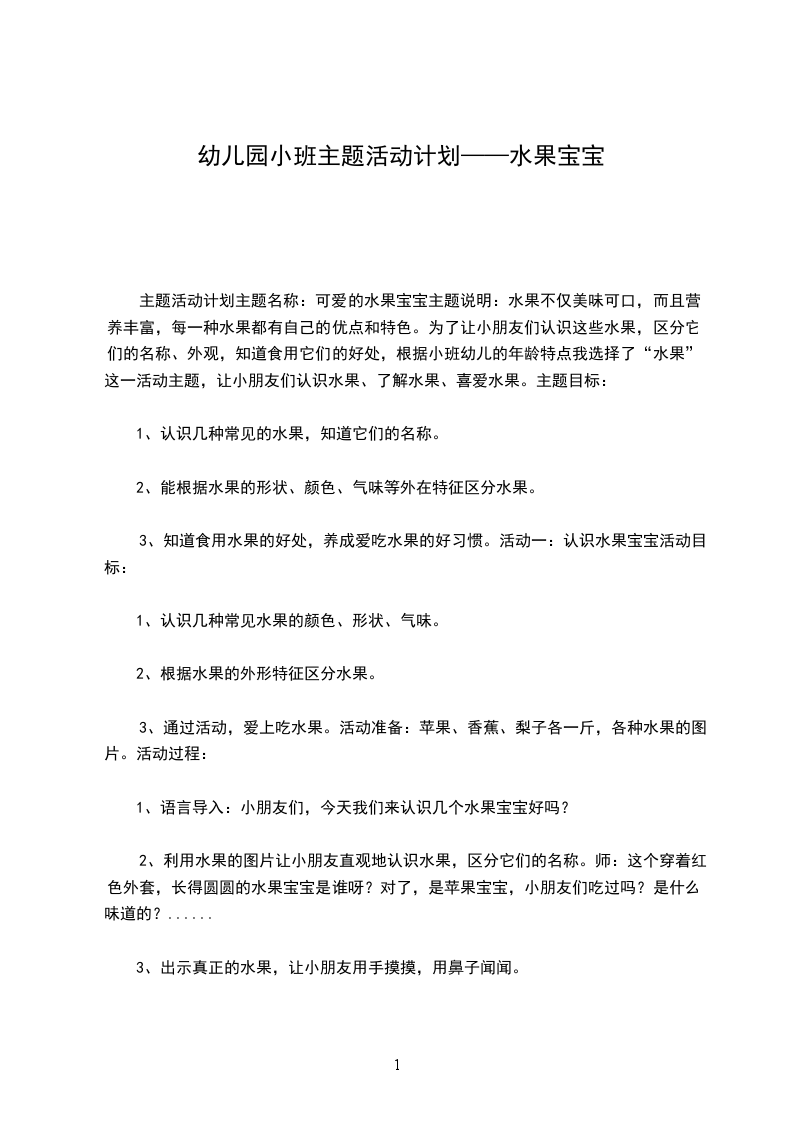 主题活动计划主题名称:可爱的水果宝宝主题说明:水果不仅美味可口,而且营养丰富,每一种水果都有自己的优点和特色。为了让小朋友们认识这些水果,区分它们的名称、外观,知道食用它们的好处,根据小班幼儿的年龄特点我选择了“水果”这一活动主题,让小朋友们认识水果、了解水果、喜爱水果。主题目标: