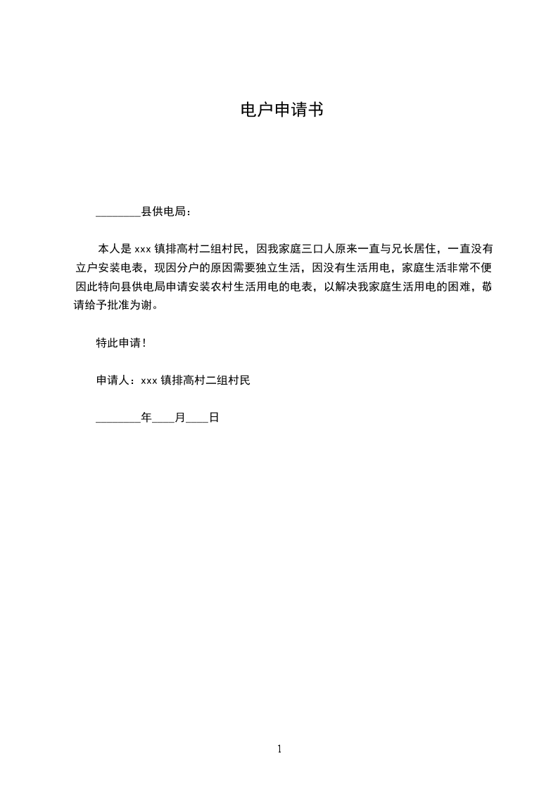 我是_________镇_________组的一位农村村民,姓名:,性别:,身份证号:,联系电话:(或),家庭人口5人,特申请贵单位安装220V照明用电,功率大约5000W.安装地址:___________________________。