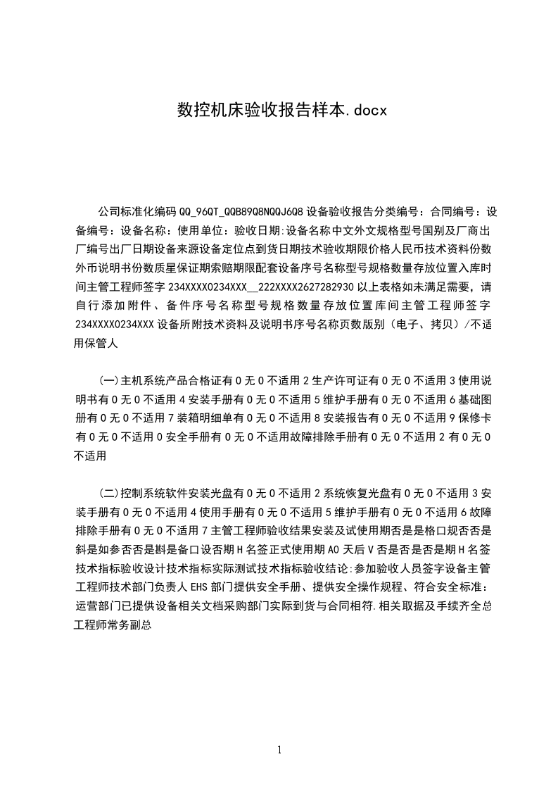 公司标准化编码QQ_96QT_QQB89Q8NQQJ6Q8设备验收报告分类编号:合同编号:设备编号:设备名称:使用单位:验收日期:设备名称中文外文规格型号国别及厂商出厂编号出厂日期设备来源设备定位点到货日期技术验收期限价格人民币技术资料份数外币说明书份数质星保证期索赔期限配套设备序号名称型号规格数量存放位置入库时间主管工程师签字234XXXX0234XXX__222XXXX2627282930以上表格如未满足需要,请自行添加附件、备件序号名称型号规格数量存放位置库间主管工程师签字234XXXX0234XXX设备所附技术资料及说明书序号名称页数版别(电子、拷贝)/不适用保管人
