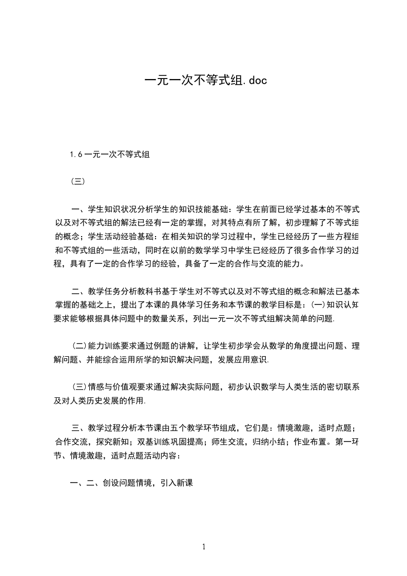 1.4一元一次不等式。通过鲁X发明锯的故事激发学生的积极性,同时引导学生明确什么是类比思想,有很自然的导入新课类比探究展示自我一元一次不等式不等式的定义