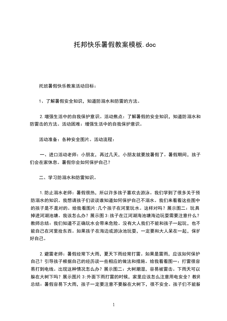 2.引导孩子了解一些暑假防雷防交通应注意的安全知识。活动焦点:让孩子对暑假的安全知识有一个初步的了解,过一个愉快的暑假。活动困难:引导孩子了解一些暑假防雷防交通应注意的安全知识。