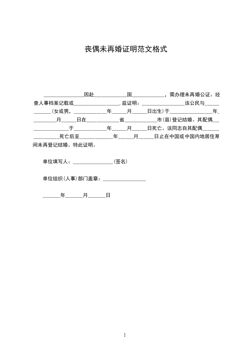 ________________因赴_____________国_____________,需办理未再婚公证。经查人事档案记载或__________________,兹证明:_________________该公民与_____________(女或男,_____________年______月______日出生)于_________________年__________月______日在_____________省_____________市(县)登记结婚。其配偶_________________于_____________年______月______日死亡。该同志自其配偶_________________死亡后至_____________年______月______日止在中国或中国内地居住期间未再登记结婚。特此证明。