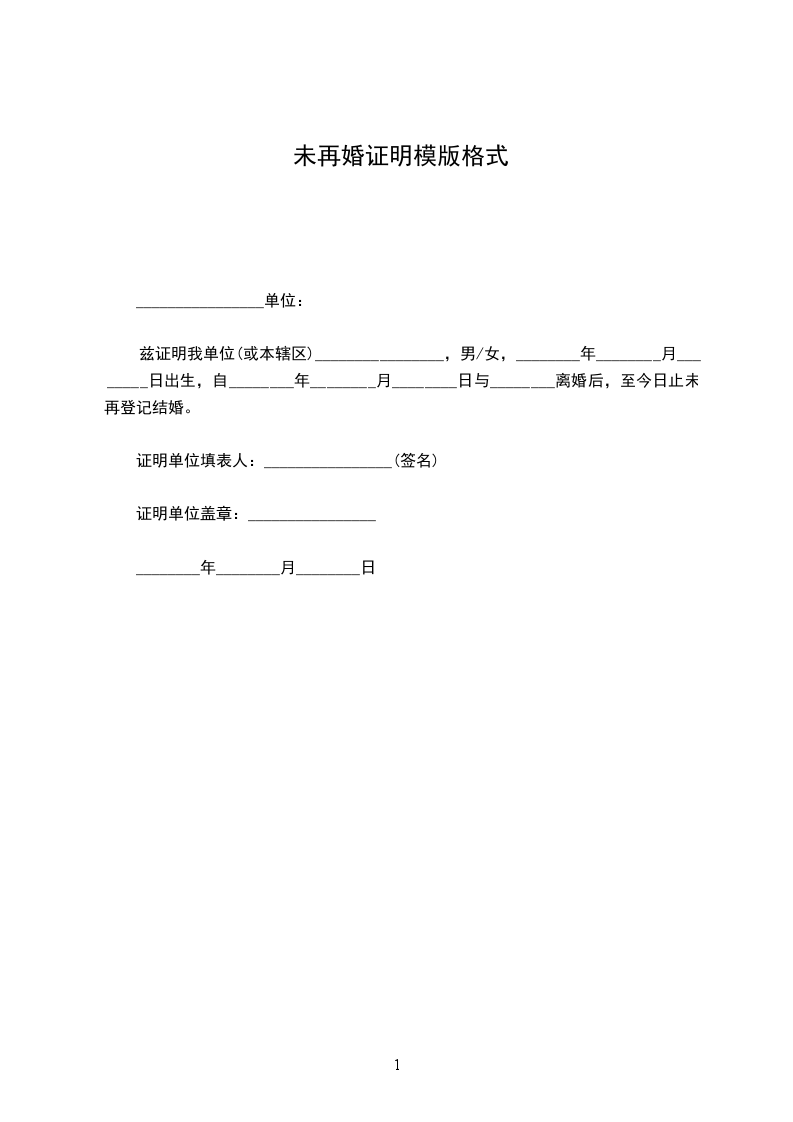 兹证明我单位(或本辖区)________________,男/女,________年________月________日出生,自________年________月________日与________离婚后,至今日止未再登记结婚。