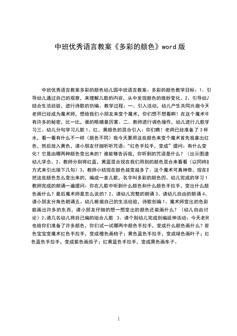 小班语言课彩虹的颜色教案5篇彩虹,又称天虹,简称为虹,是气象中的一种光学现象。当太阳光照射到空气中的水滴时,光线被折射及反射,在天空上形成拱形的七彩光谱,雨后常见。小班语言课彩虹的颜色教案教学目标了解彩虹的色彩排序,认识常用色;灵活运用所学的知识,画一幅有彩虹的画;增加学生的自然常识。课时安排一课时。教学准备七色色标卡片、混色示范工具、多媒体实物投影展示平台等。教学重点认识并能准确排序彩虹的七种颜色。教学难点大胆想象并表达自己对彩虹的情感或者关于彩虹的故事。教学过程教师的活动学生的活动目标设疑导入师:小朋友你知道美丽彩虹是有哪七种颜色组成的吗?教师出示七种颜色的色标卡。学生:红、橙、黄、绿、青、蓝、紫。学生辨认七种不同的色彩。具体认识表现彩虹的七种色彩的名称。分析理解师:小朋友,你知道这七种颜色的正确顺序吗?为什么会是这样的呢?学生根据教材说出七种颜色的正确顺序。混色游戏教师示范将红色水杯和_水杯的水相互混合后,引导学生观察变化;再请小朋友把黄、蓝两色和红、黄两色分别混合,观察颜色的变化;从自己的彩色笔盒子中按照顺序找出七种颜色。学生参与混色游戏活动,并在活动中观察和学习色彩的变化,看一看色彩的变化,说一说观察的结果。通过直观的游戏活动进一步认识颜色,增强学生对色彩变化的注意力。欣赏感知教师引导学生观察教材中的范图并请学生说一说自己看了这些画以后的想法。你能正确并按照顺序表现彩虹的七种颜色吗?你能比其他的小朋友想象的更奇特吗?学生欣赏教材范图,巩固彩虹的七种颜色以及其顺序印象。说一说自己的感受和想法。增强体验,在体验中加强知识的记忆并为激发思维做铺垫。自主表现教师引导学生大胆想象:你想把彩虹画成什么?美丽的彩虹是降落伞的伞顶、美丽的空中河道-;请学生说一说,画一画,教师巡回辅导。学生在老师的启发下大胆用语言表达自己对彩虹的想象。学生绘画活动,表现自己的想象或则表现和彩虹有关的故事。运用语言激发思维,在绘画活动中锻炼思维能力提高绘画表现能力。总结评价教师总结。学生自评和互评。总结教学小班语言课彩虹的颜色教案2活动目标